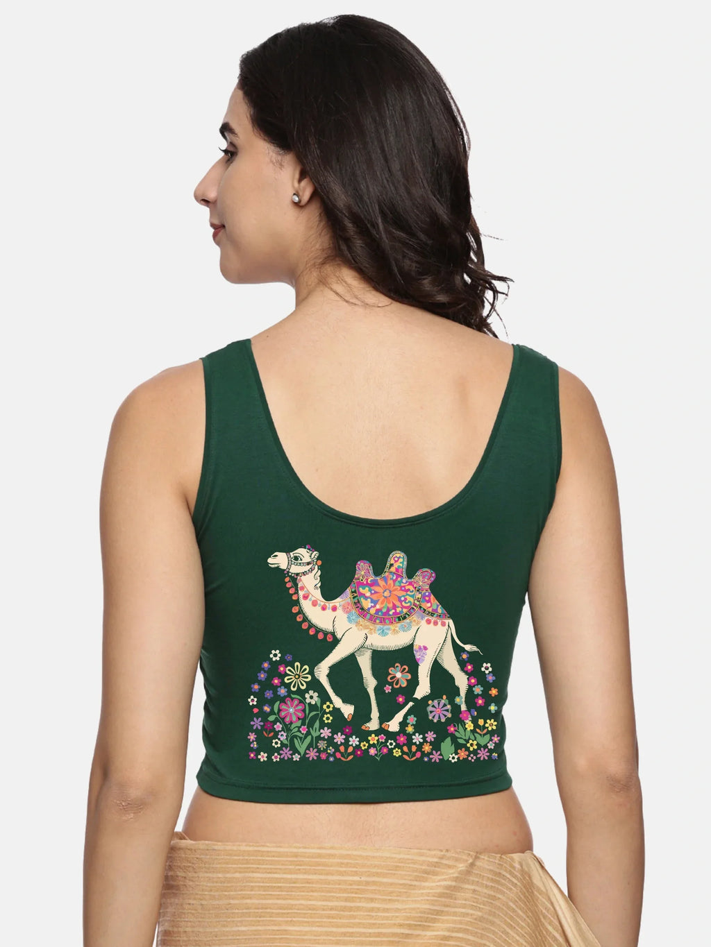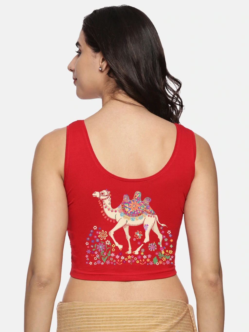 Solid blouse with back print in stretchable soft cotton, has a round neckline, has 2 front darts for best fitting. The blouse has a double layer front so that it fits gracefully. Can also insert boob pads for convienience.