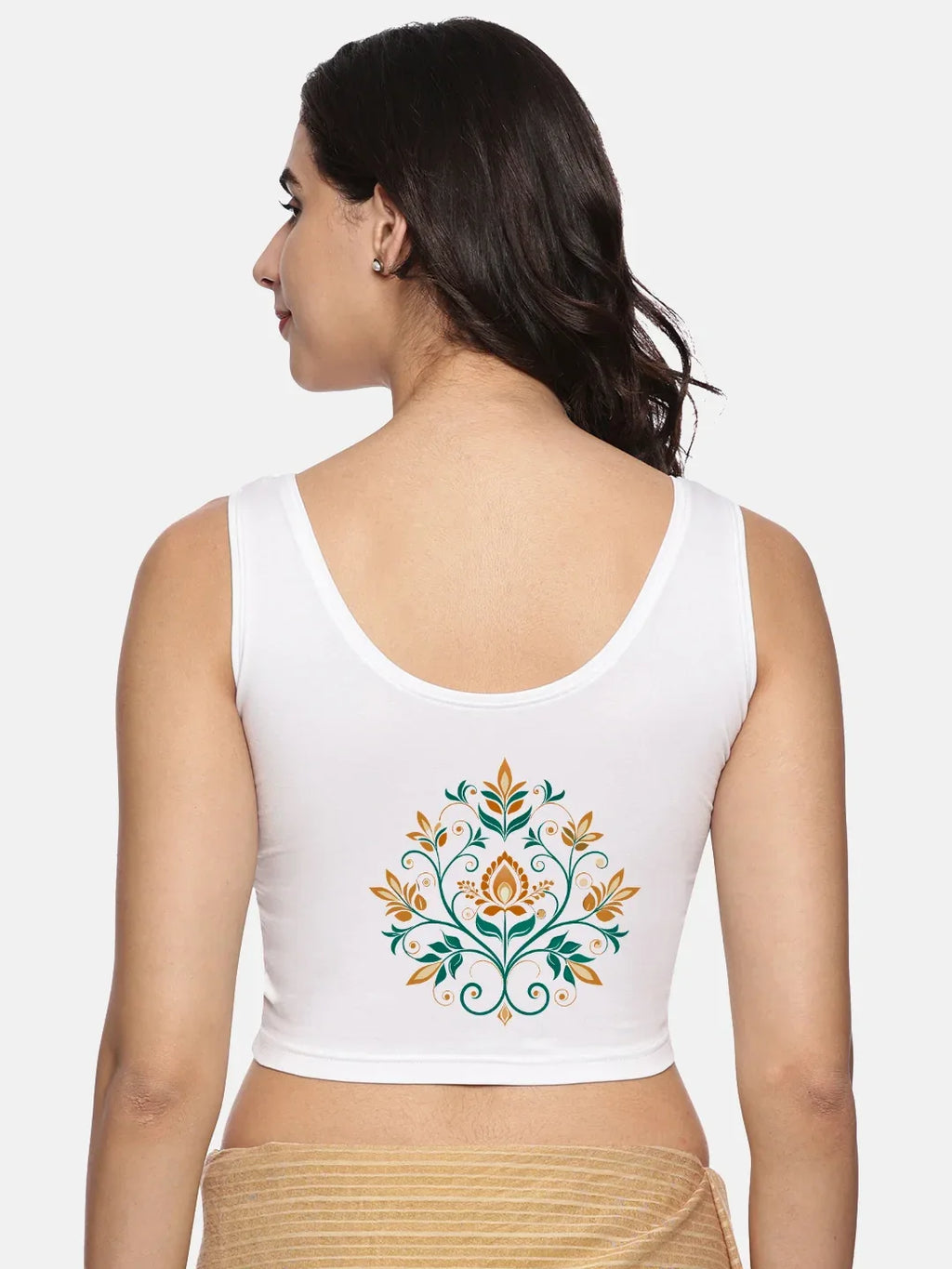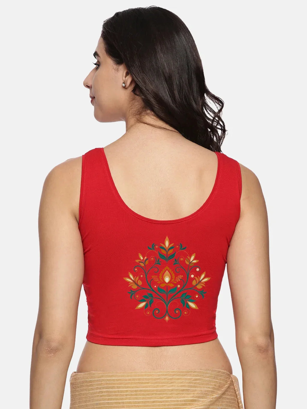 Solid blouse with back print in stretchable soft cotton, has a round neckline, has 2 front darts for best fitting. The blouse has a double layer front so that it fits gracefully. Can also insert boob pads for convienience.