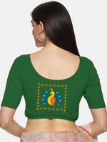 Solid blouse with back print in stretchable soft cotton, has a round neckline, has 2 front darts for best fitting, sleeve length till the elbow. The blouse has an elasticated bottom to avoid spillage