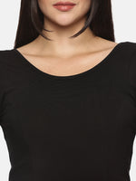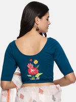 Solid blouse with back print in stretchable soft cotton, has a round neckline, has 2 front darts for best fitting, sleeve length till the elbow. The blouse has an elasticated bottom to avoid spillage