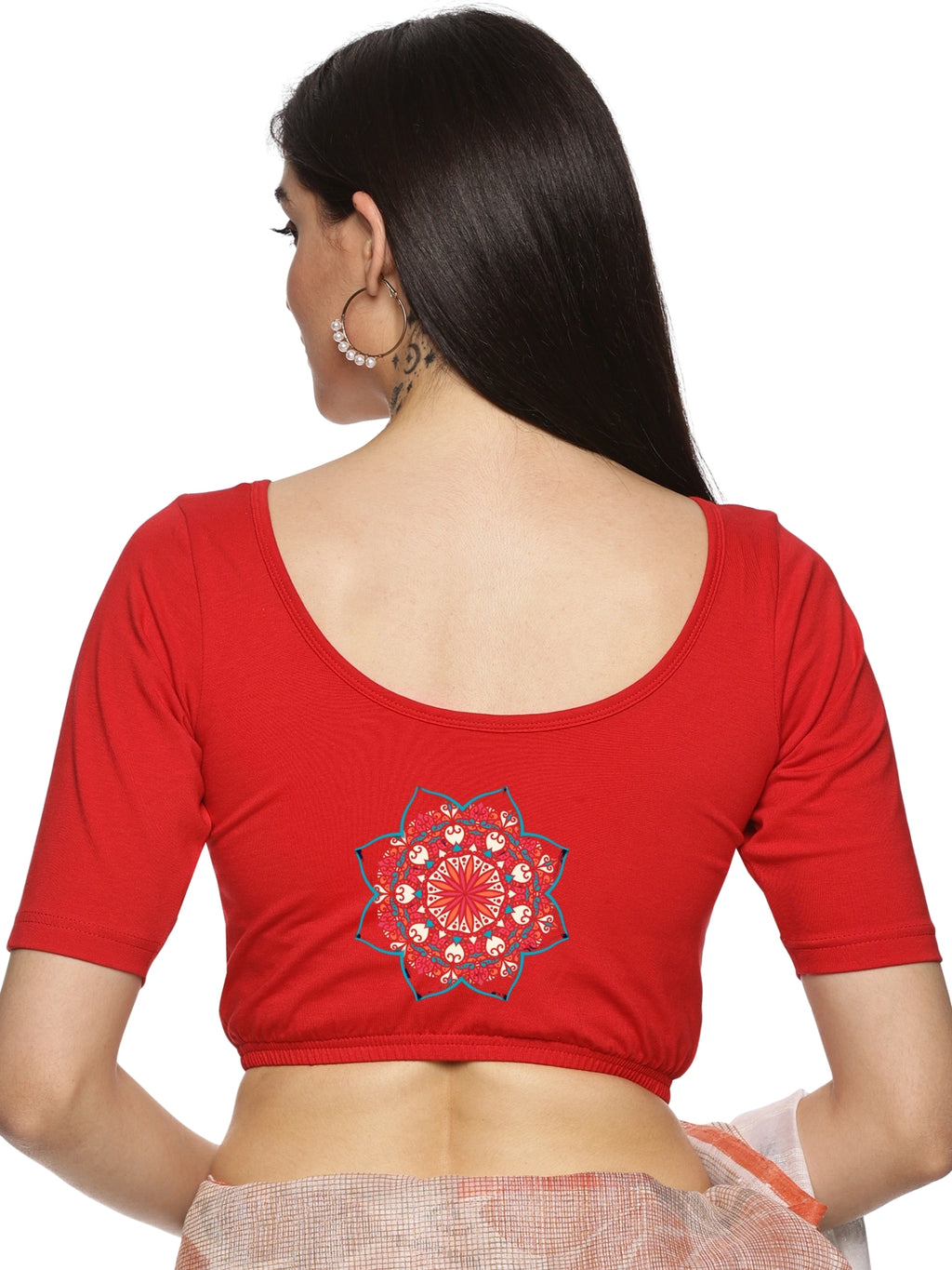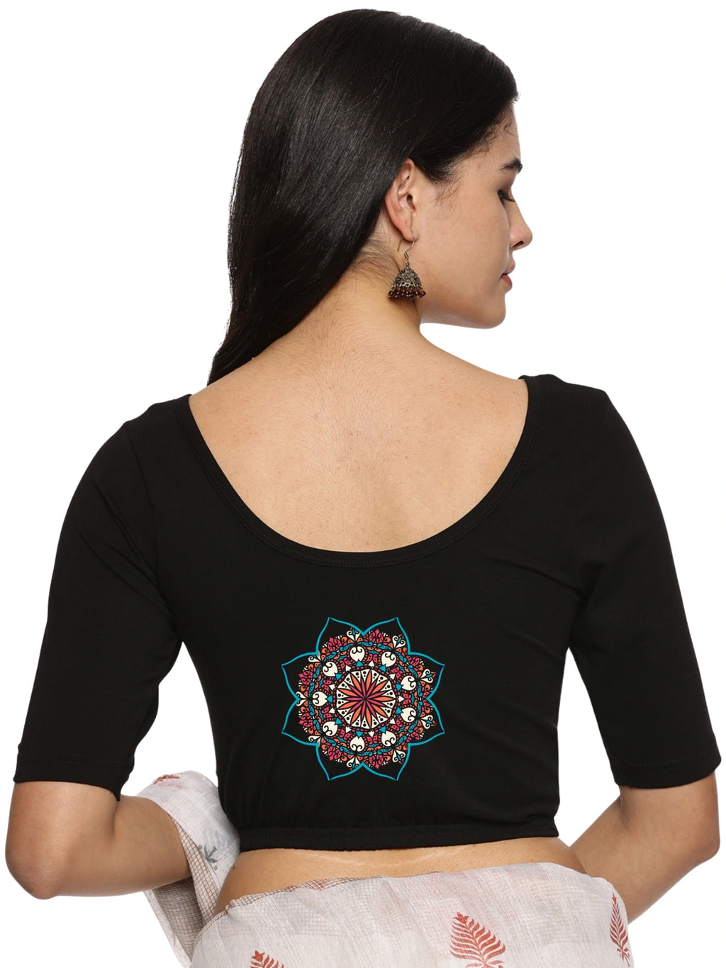Solid blouse with back print in stretchable soft cotton, has a round neckline, has 2 front darts for best fitting, sleeve length till the elbow. The blouse has an elasticated bottom to avoid spillage