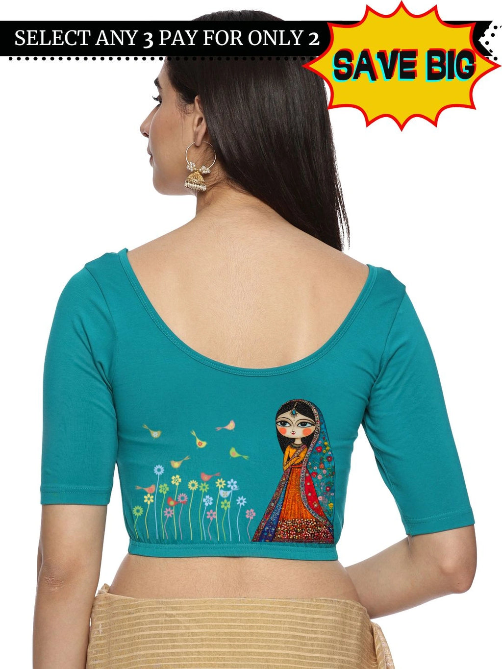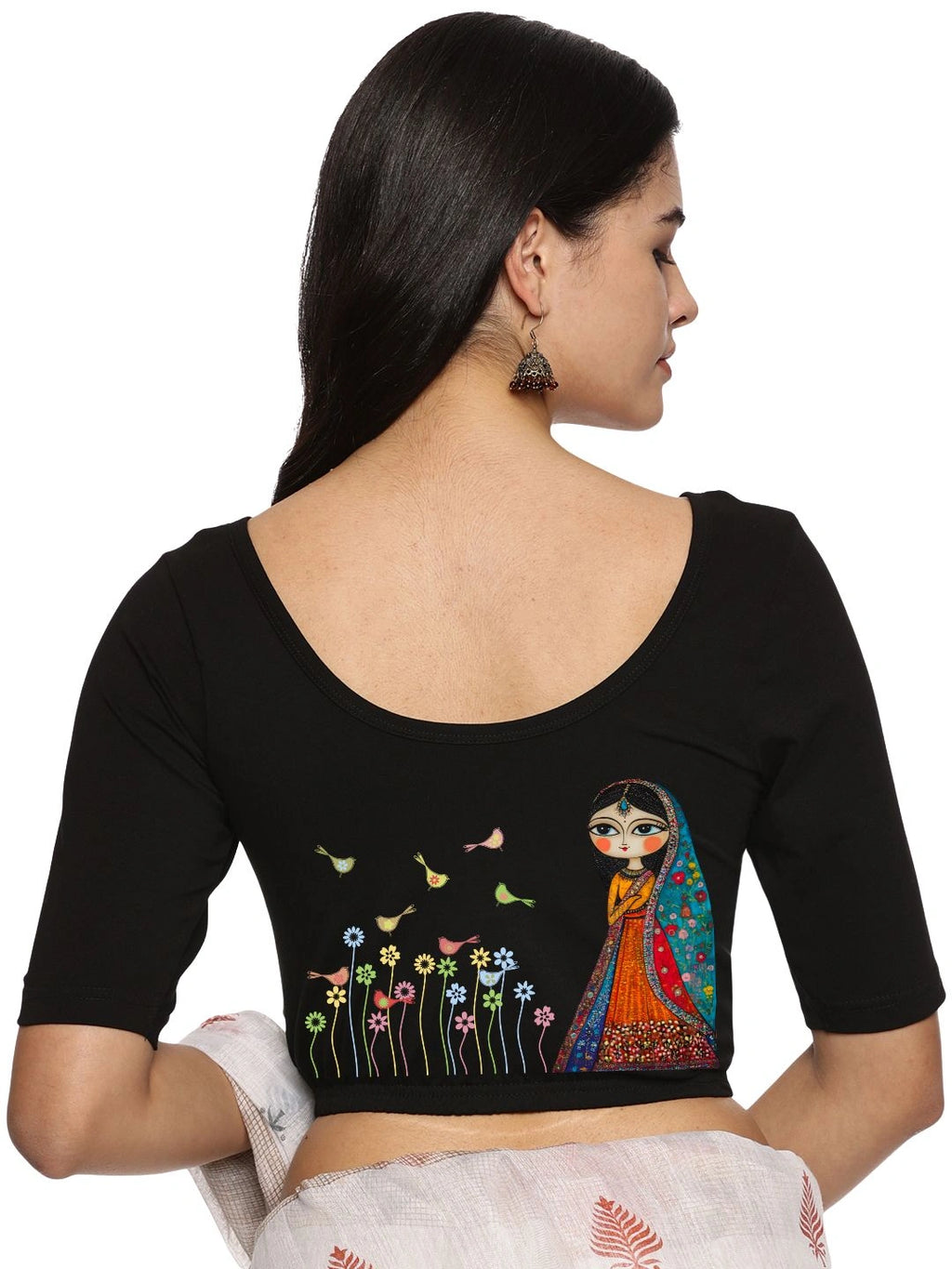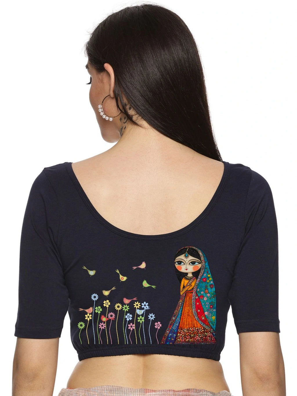 Solid blouse with back print in stretchable soft cotton, has a round neckline, has 2 front darts for best fitting, sleeve length till the elbow. The blouse has an elasticated bottom to avoid spillage