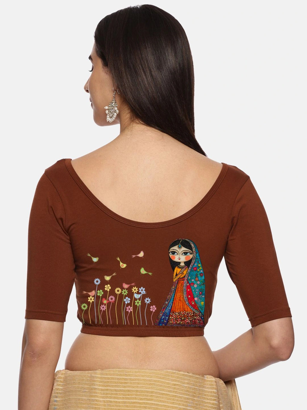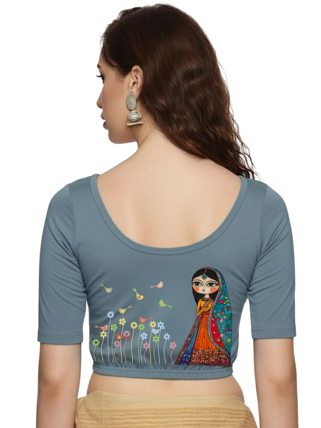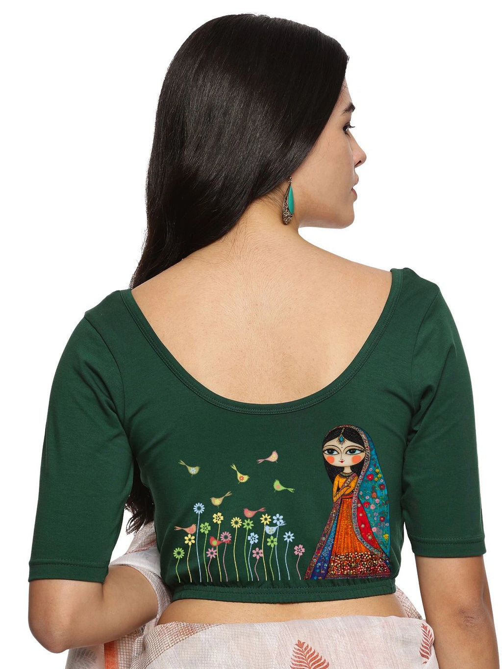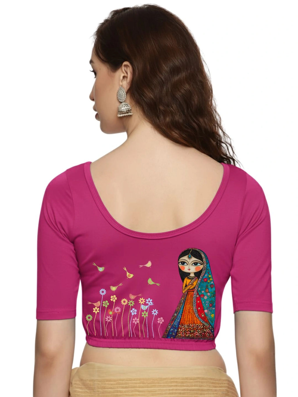 Solid blouse with back print in stretchable soft cotton, has a round neckline, has 2 front darts for best fitting, sleeve length till the elbow. The blouse has an elasticated bottom to avoid spillage