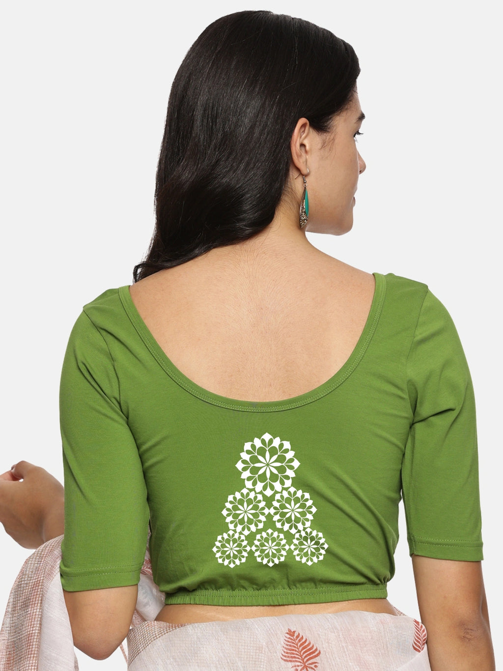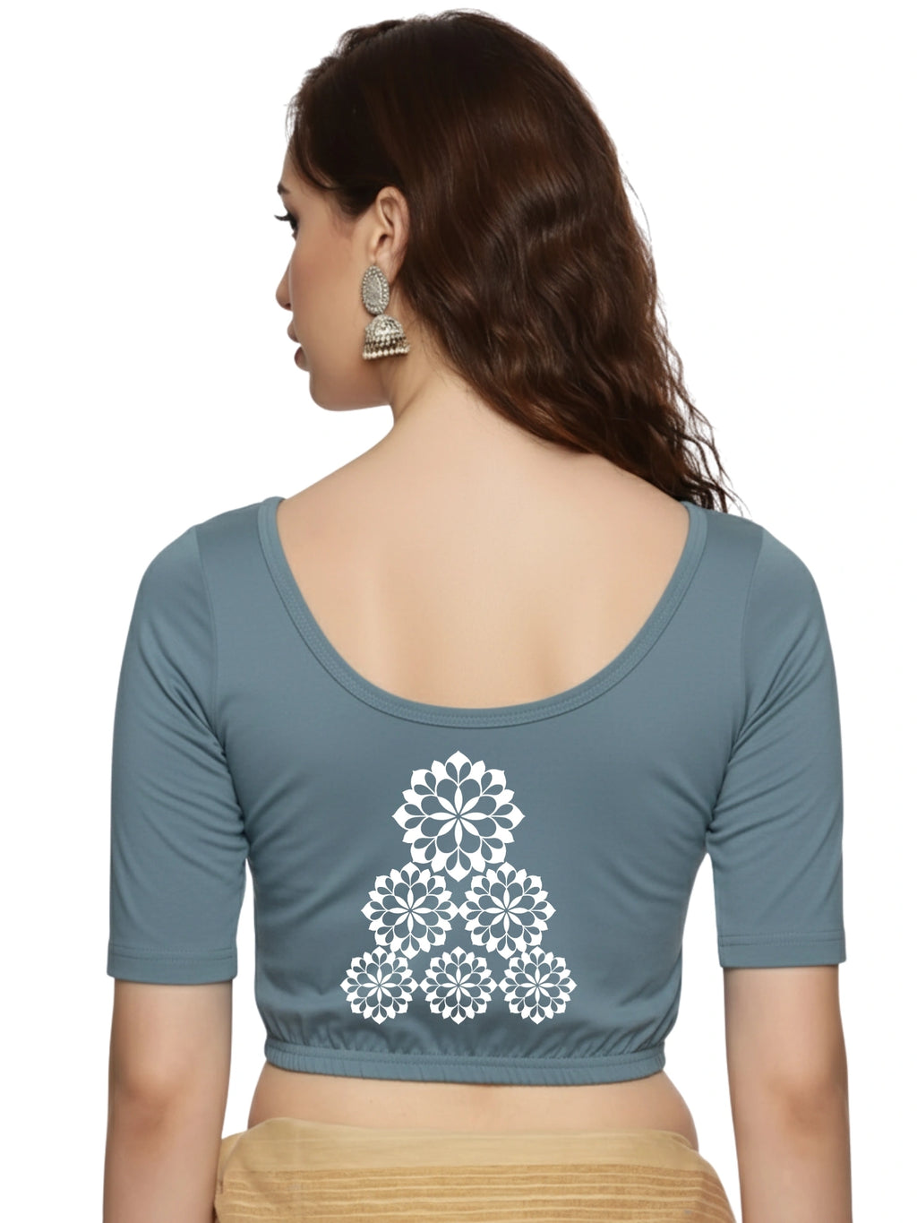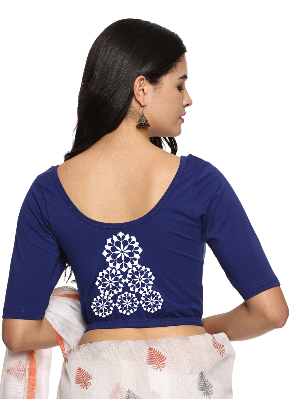 Solid blouse with back print in stretchable soft cotton, has a round neckline, has 2 front darts for best fitting, sleeve length till the elbow. The blouse has an elasticated bottom to avoid spillage