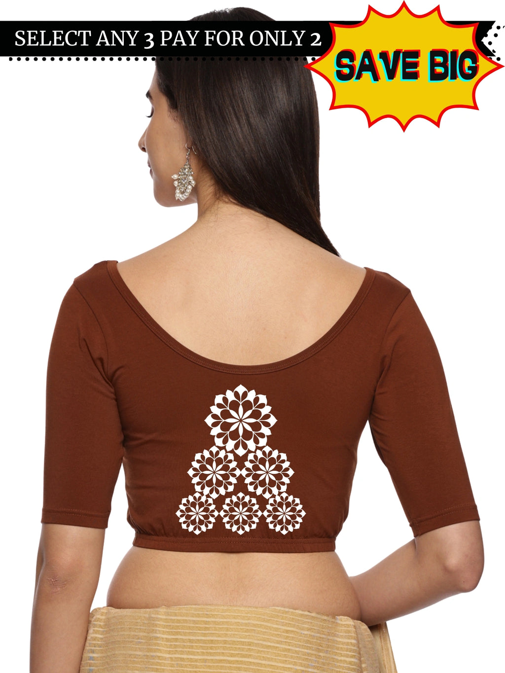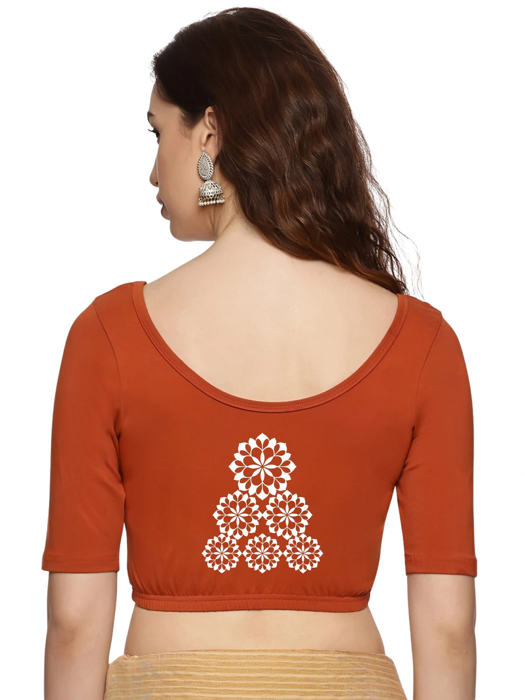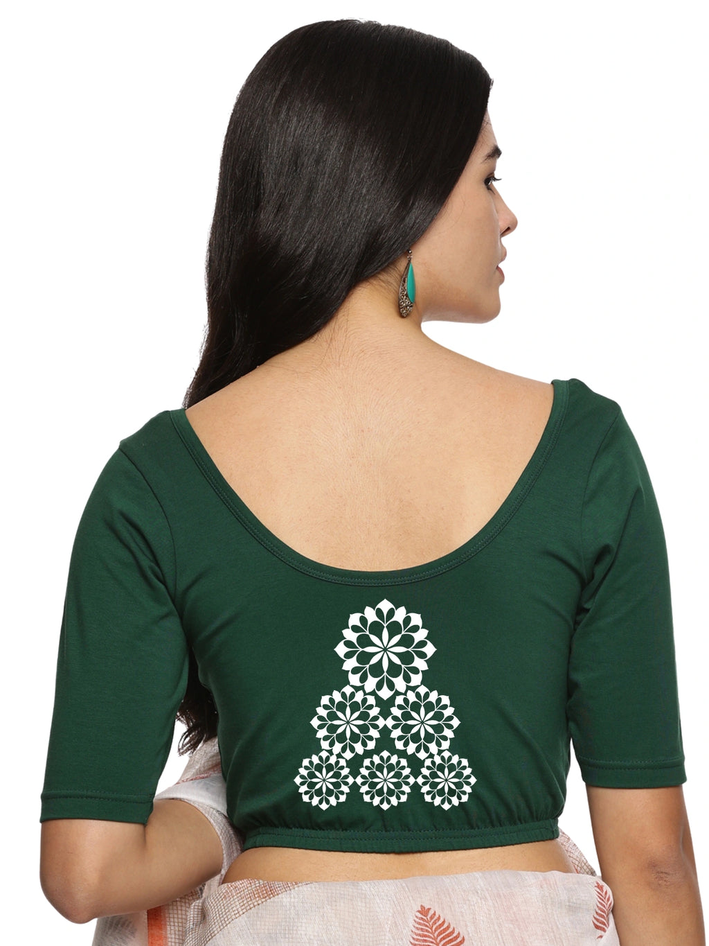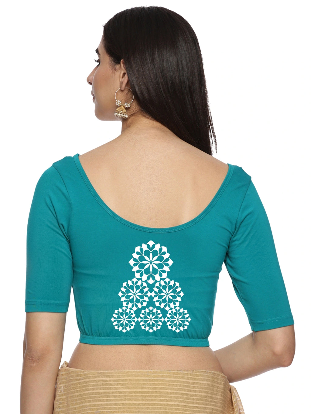 Solid blouse with back print in stretchable soft cotton, has a round neckline, has 2 front darts for best fitting, sleeve length till the elbow. The blouse has an elasticated bottom to avoid spillage