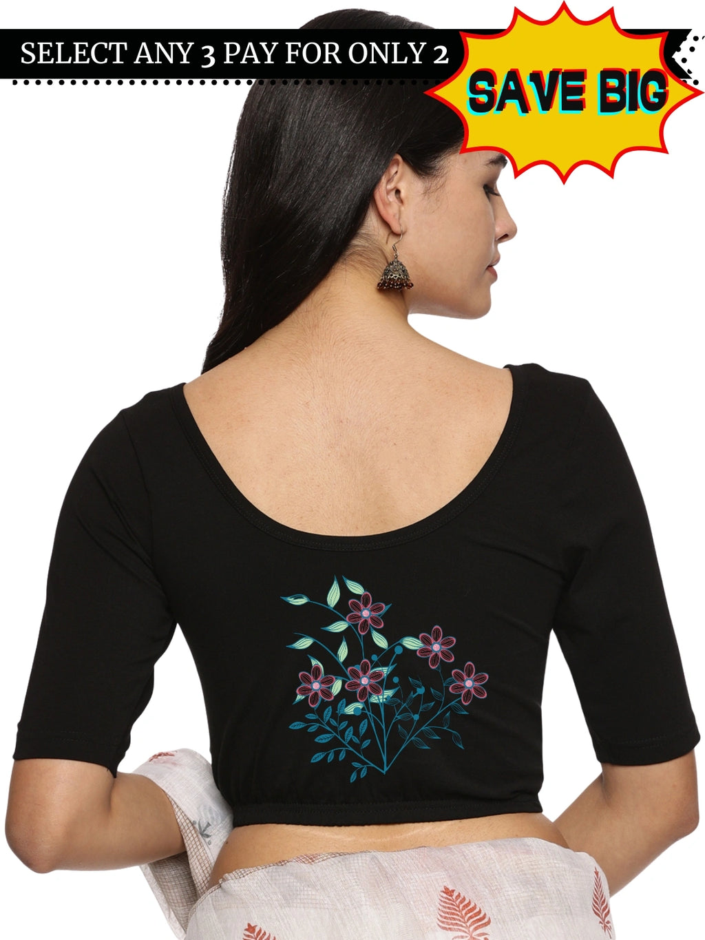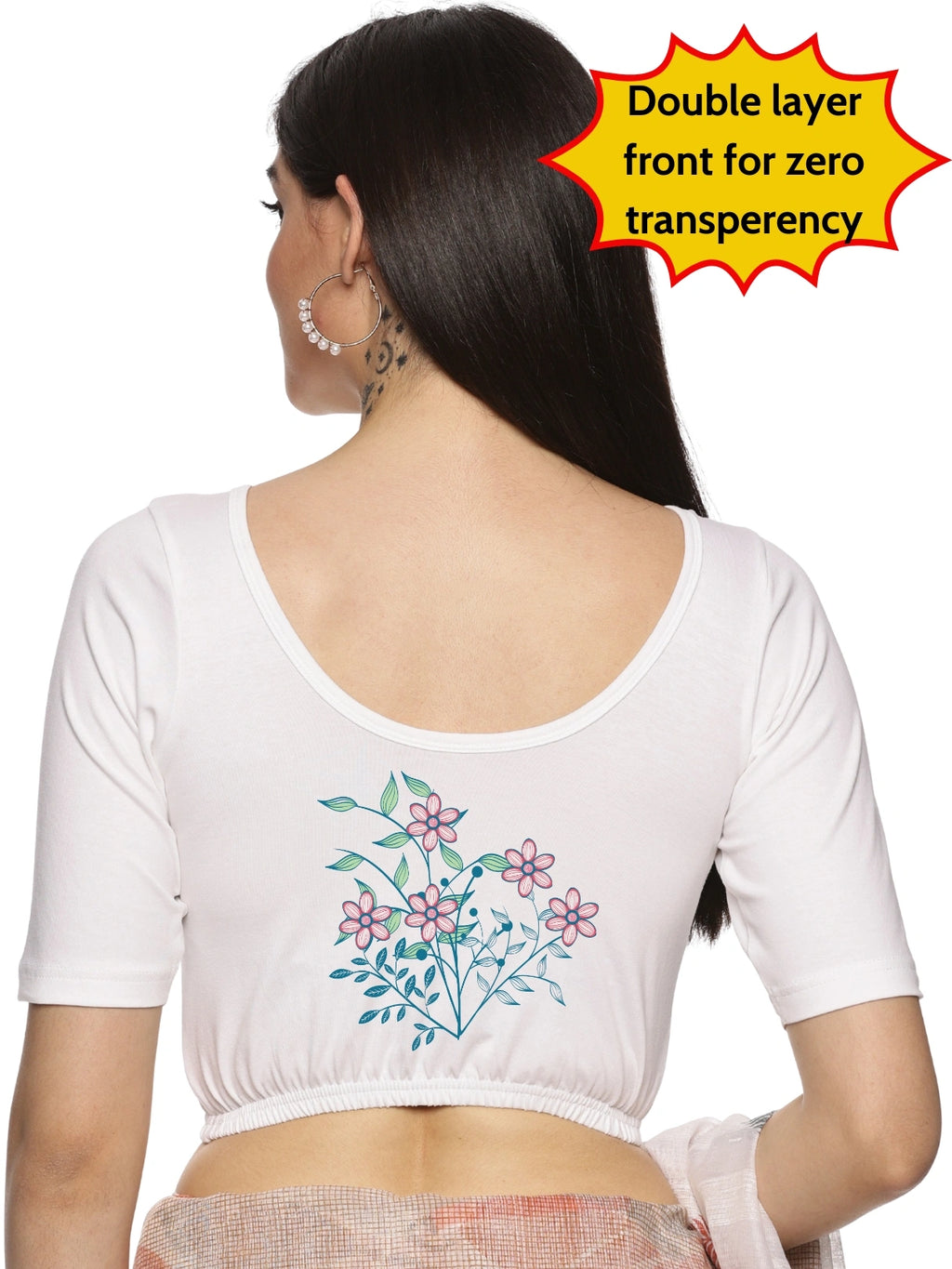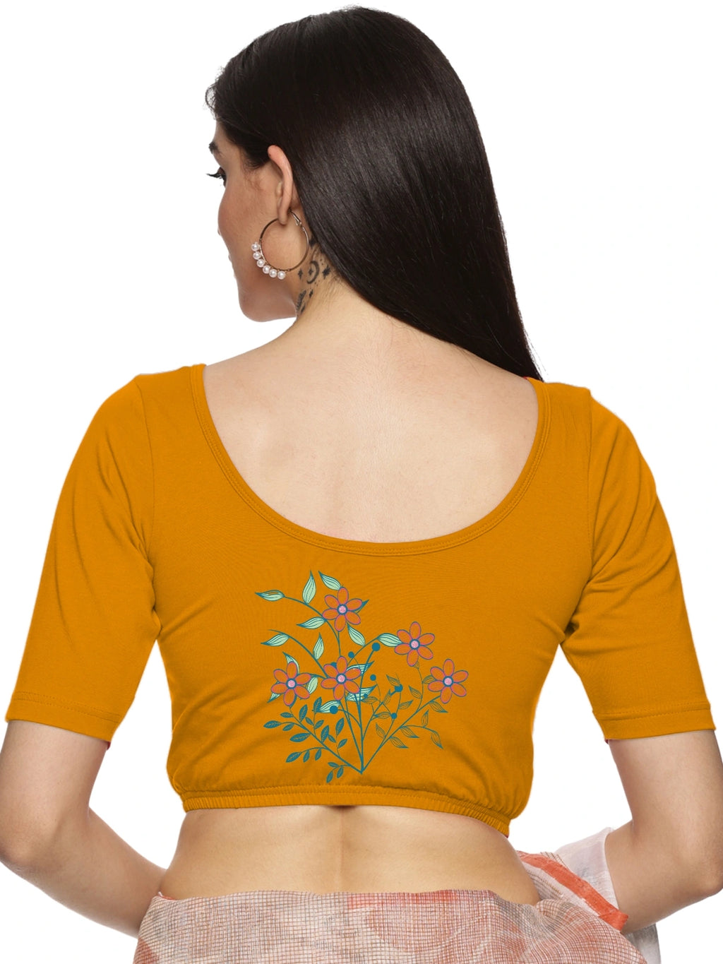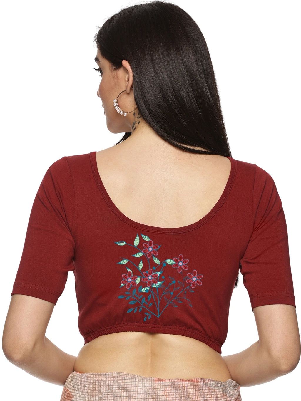 Solid blouse with back print in stretchable soft cotton, has a round neckline, has 2 front darts for best fitting, sleeve length till the elbow. The blouse has an elasticated bottom to avoid spillage