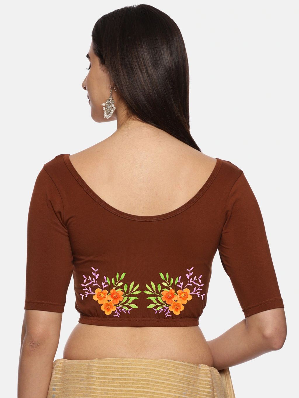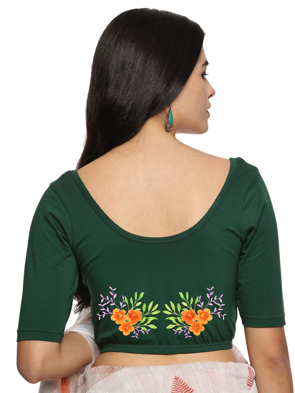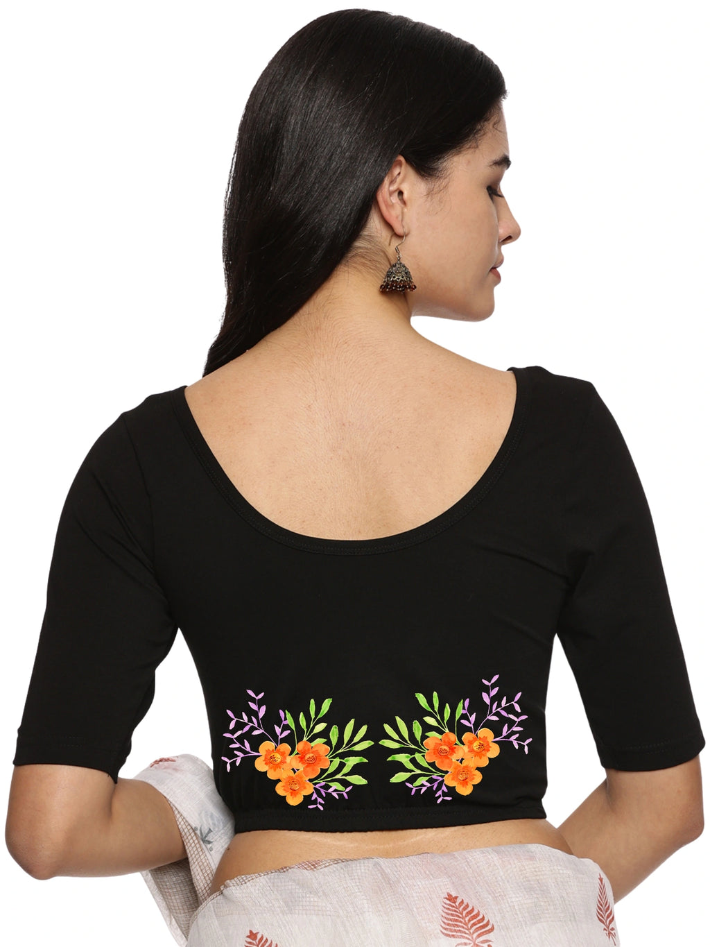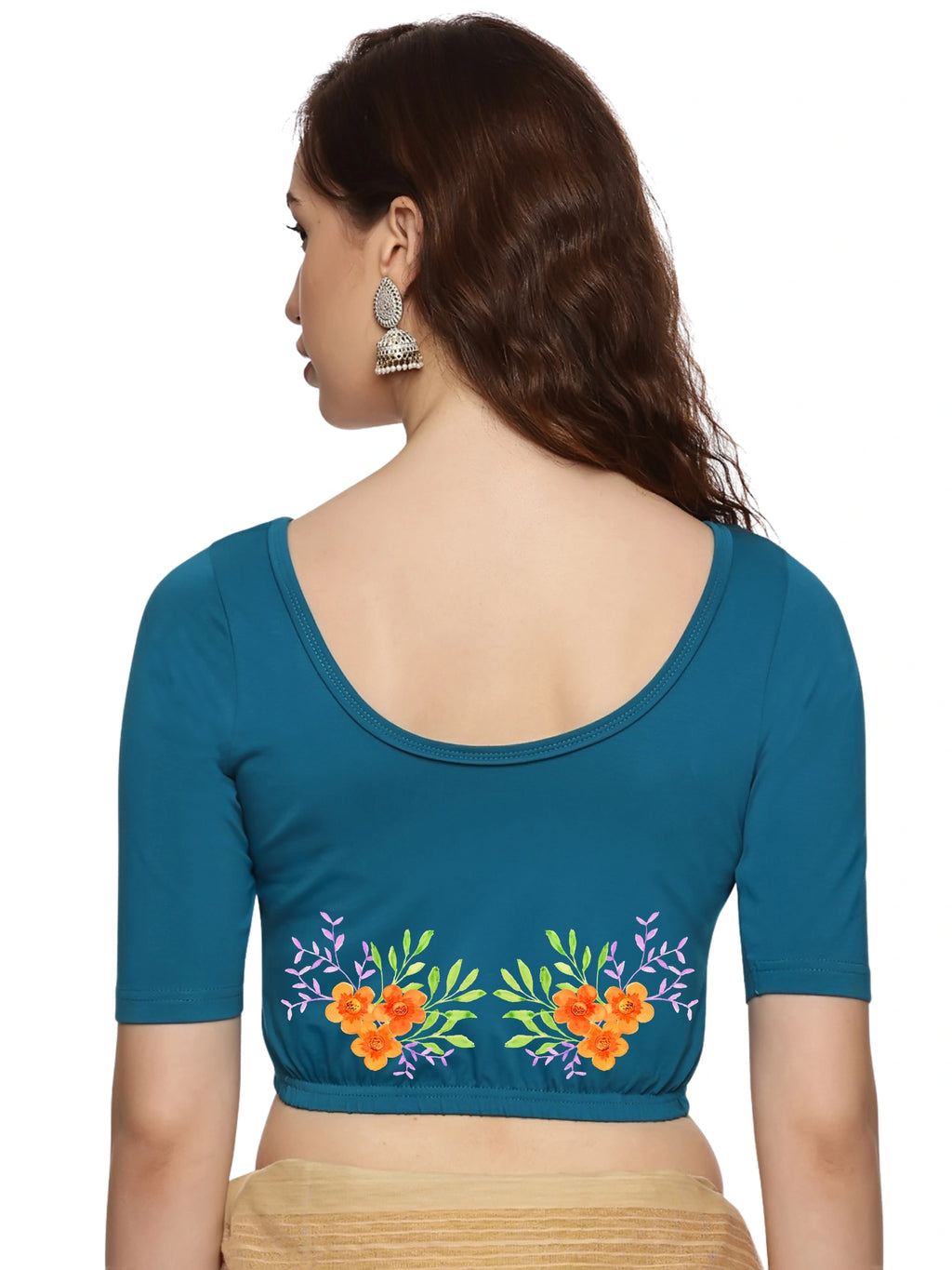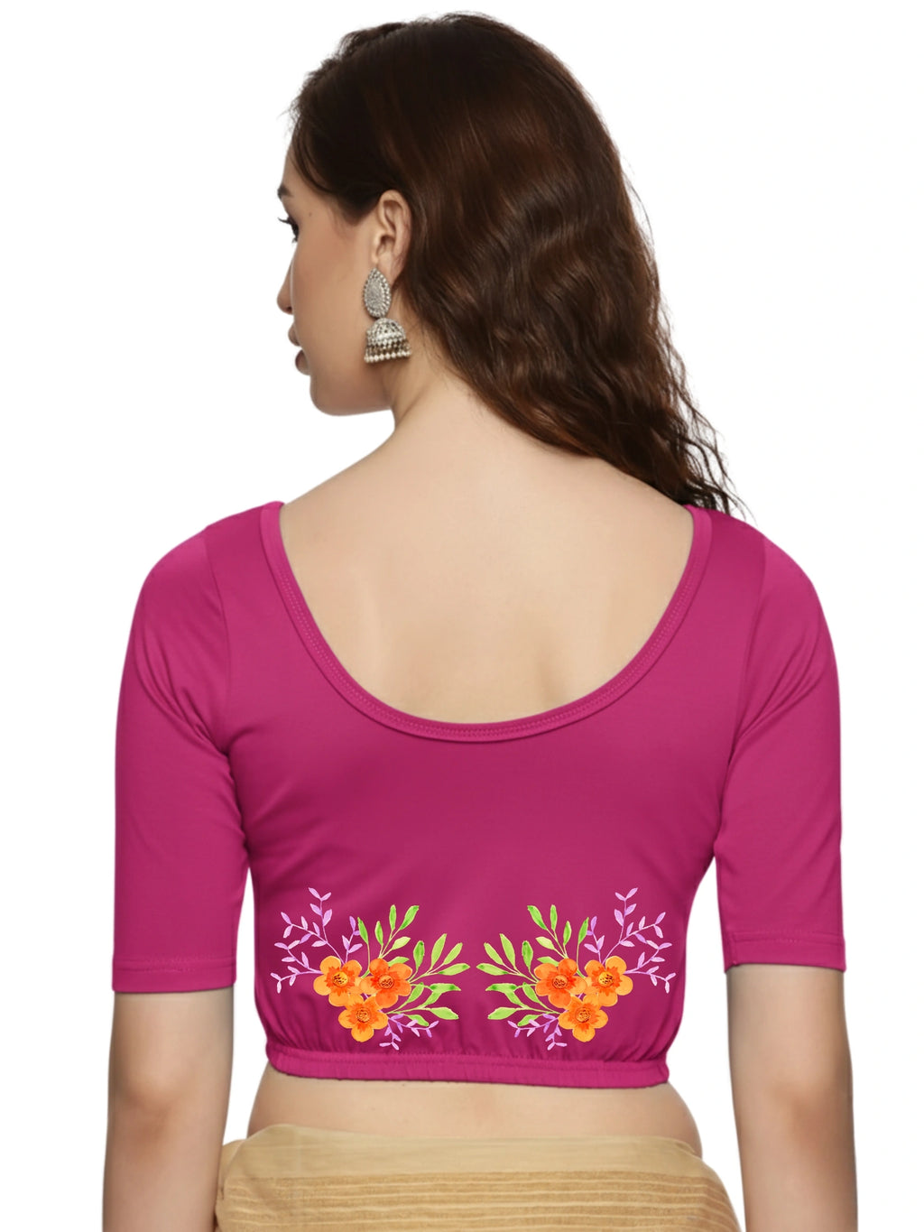 Solid blouse with back print in stretchable soft cotton, has a round neckline, has 2 front darts for best fitting, sleeve length till the elbow. The blouse has an elasticated bottom to avoid spillage