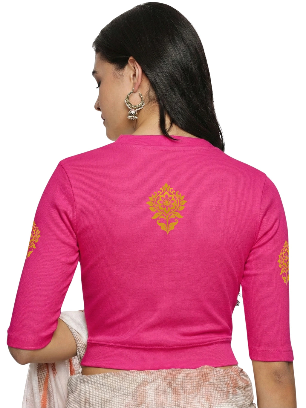 RIB blouse with back print in stretchable soft cotton, has a round neckline, sleeve length till the elbow. The blouse has a Rib double fold band at waist bottom to avoid spillage