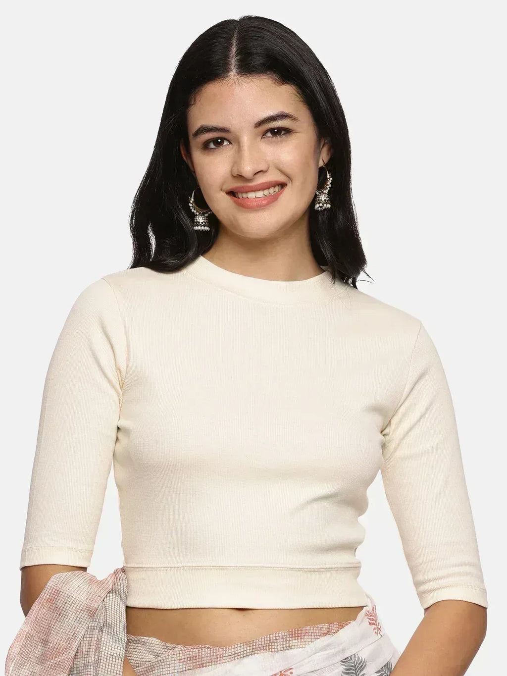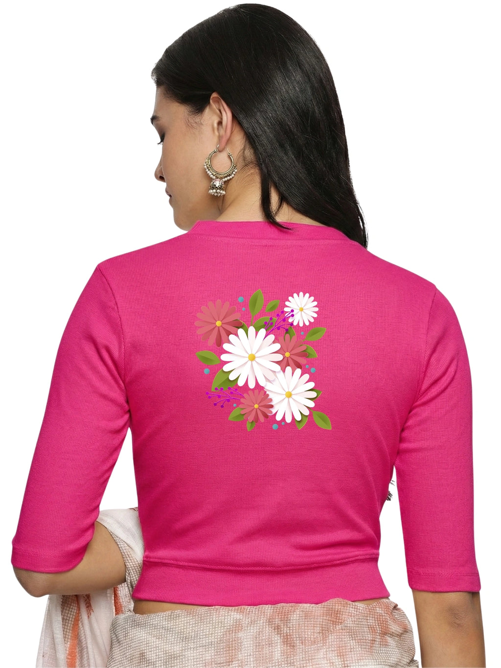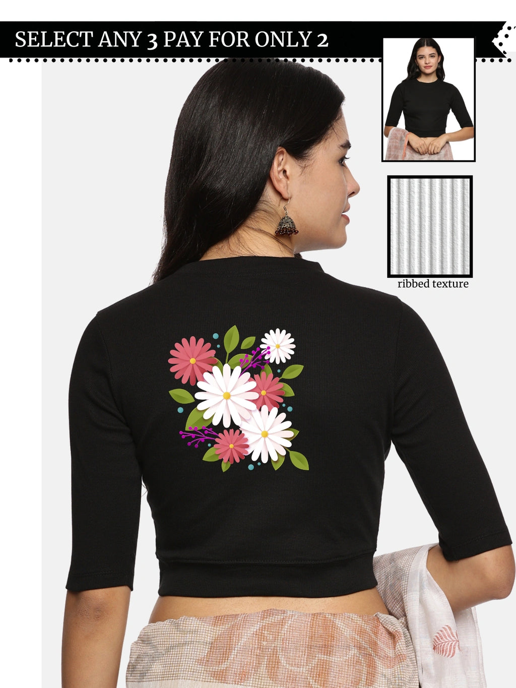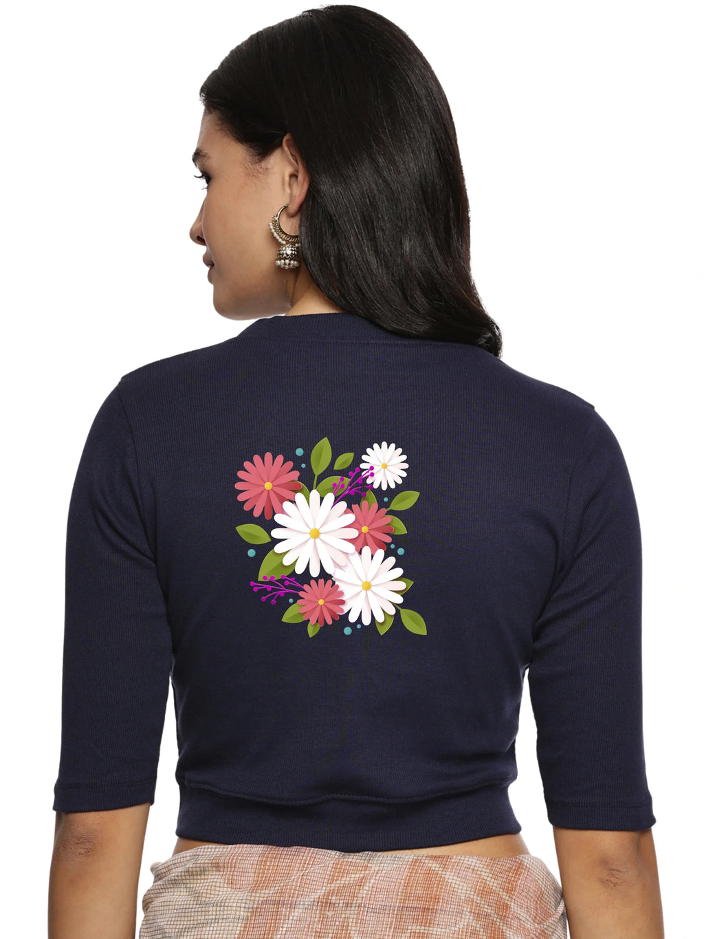 RIB blouse with back print in stretchable soft cotton, has a round neckline, sleeve length till the elbow. The blouse has a Rib double fold band at waist bottom to avoid spillage