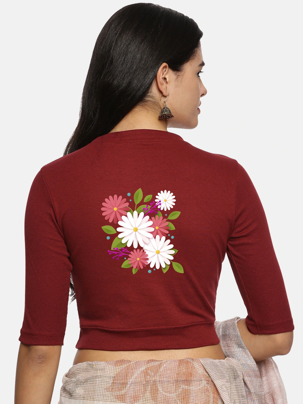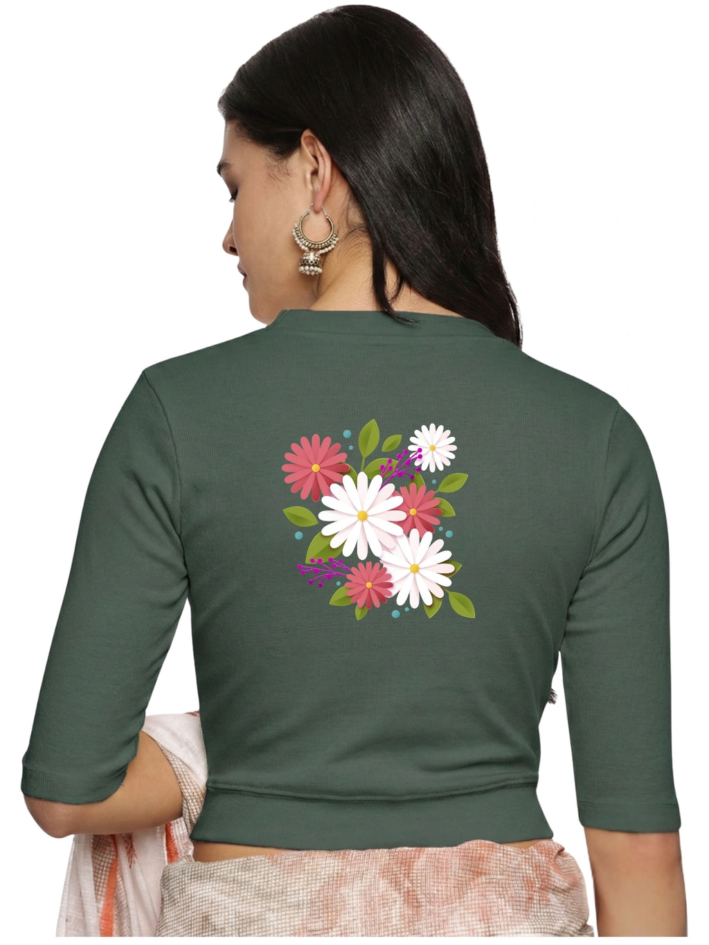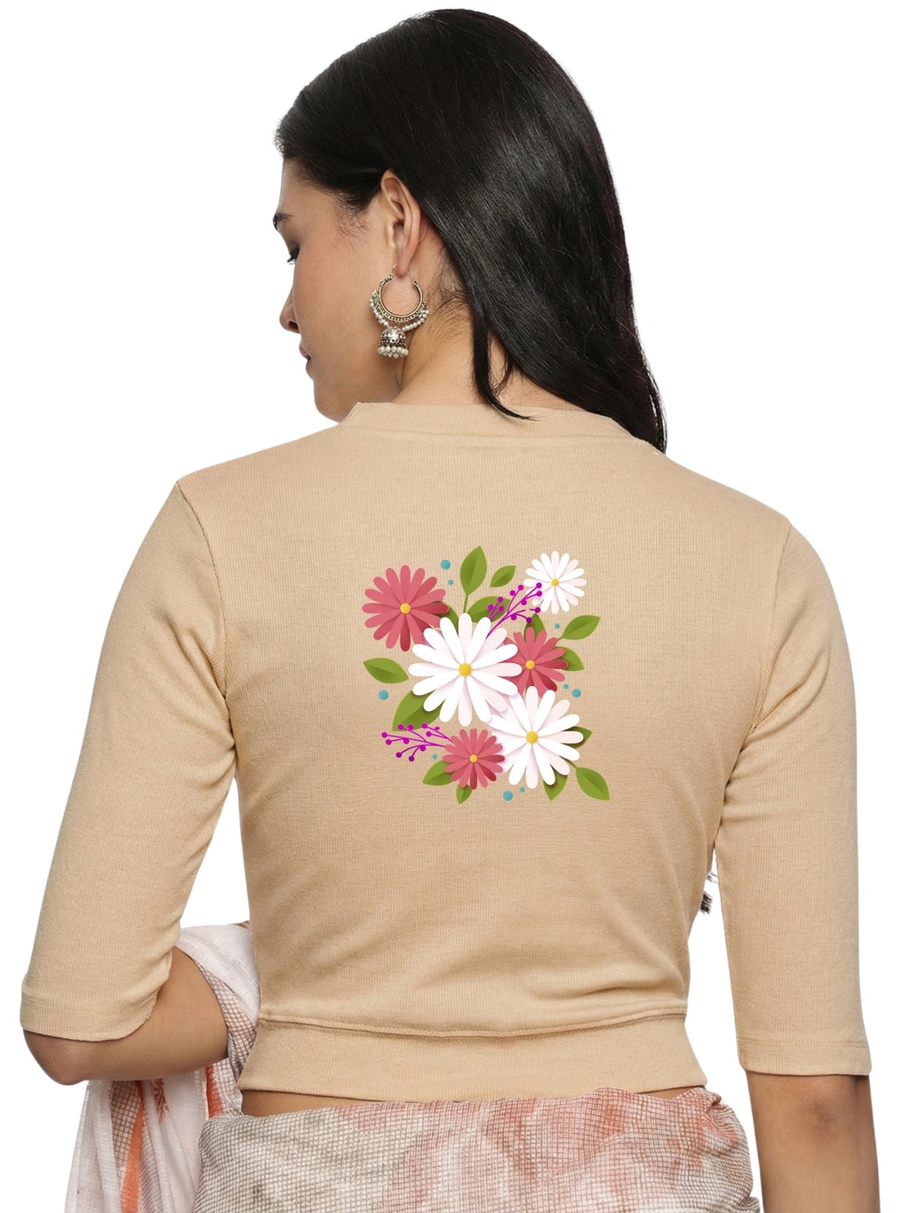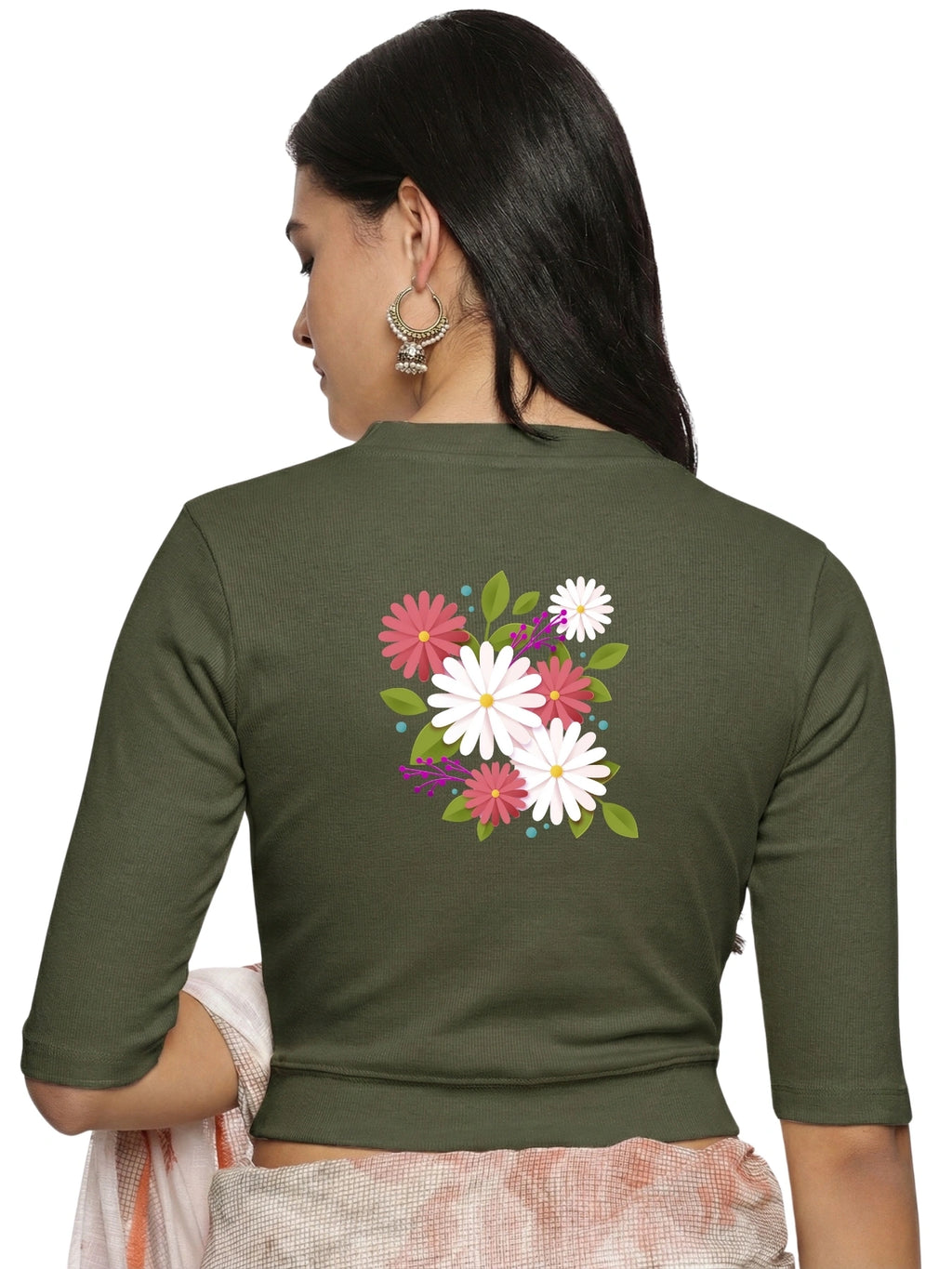 RIB blouse with back print in stretchable soft cotton, has a round neckline, sleeve length till the elbow. The blouse has a Rib double fold band at waist bottom to avoid spillage