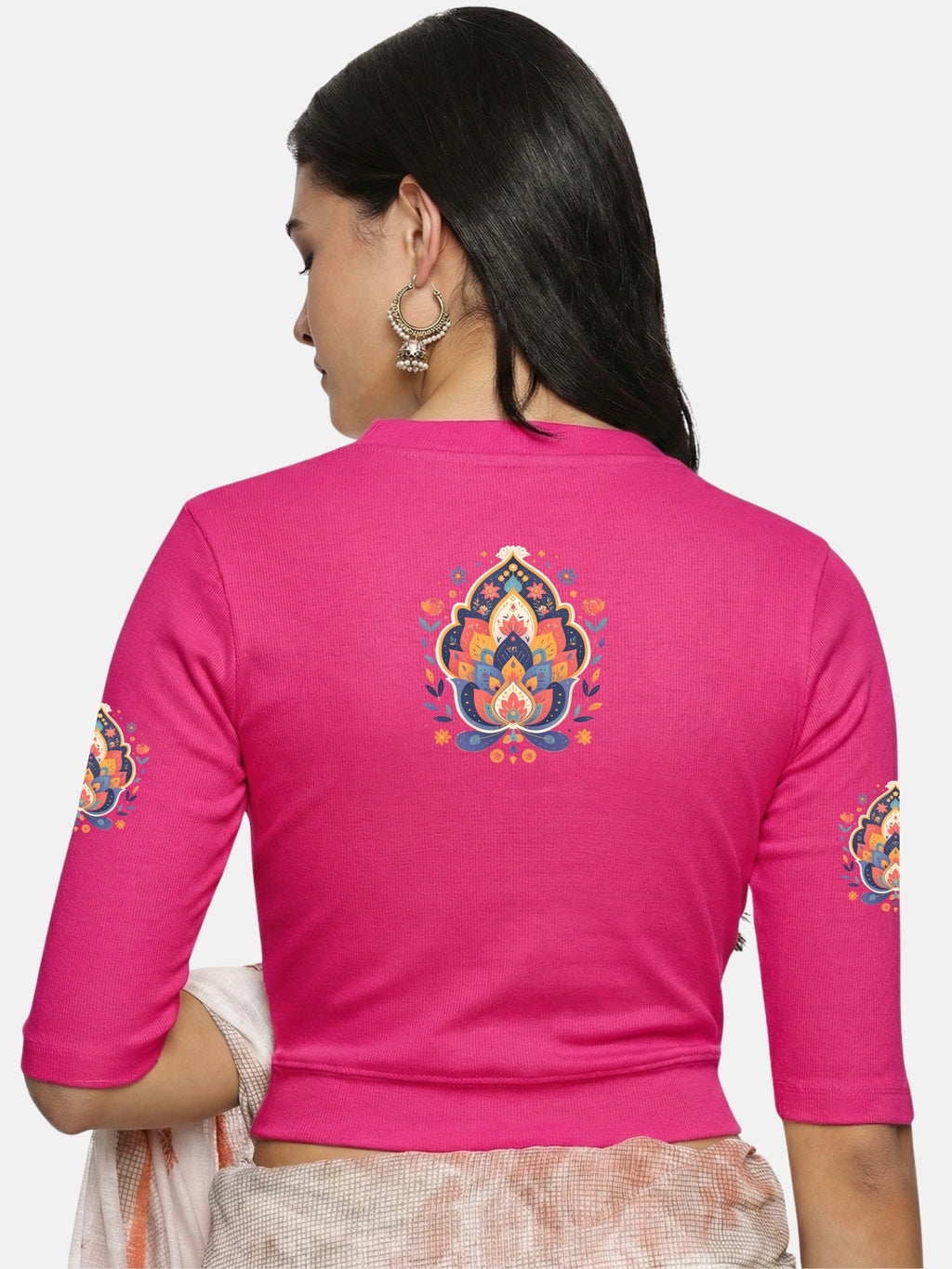 RIB blouse with back print in stretchable soft cotton, has a round neckline, sleeve length till the elbow. The blouse has a Rib double fold band at waist bottom to avoid spillage