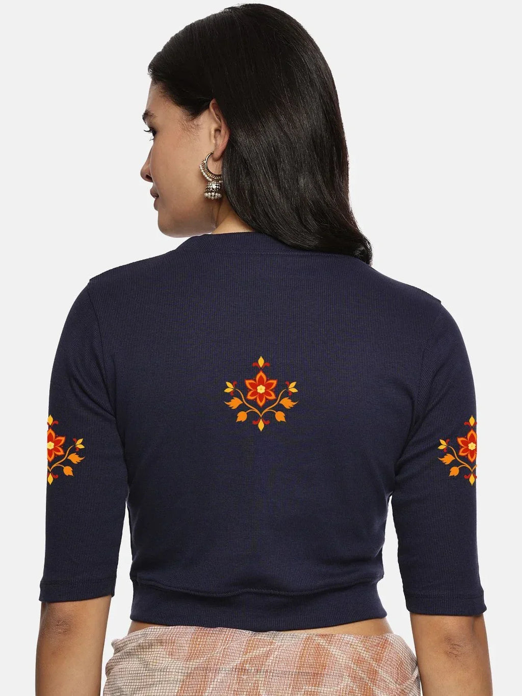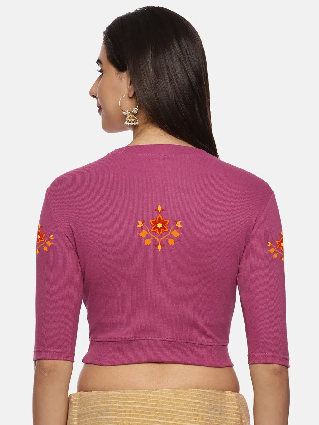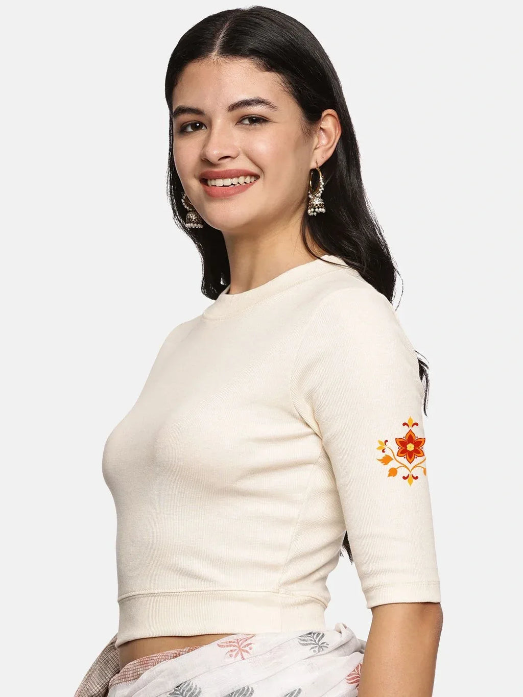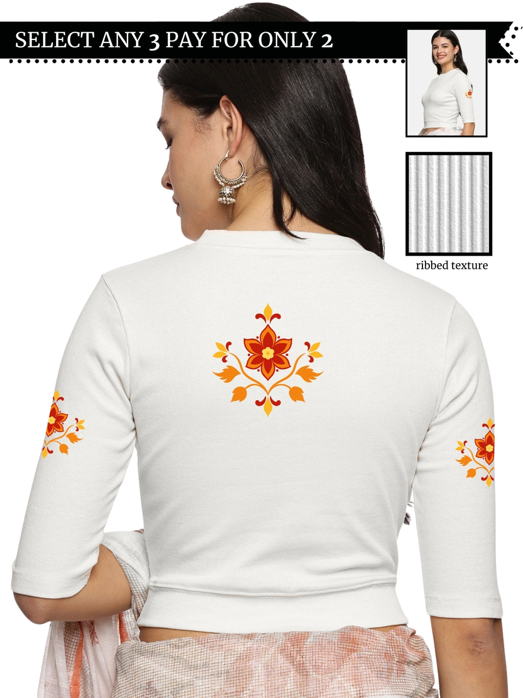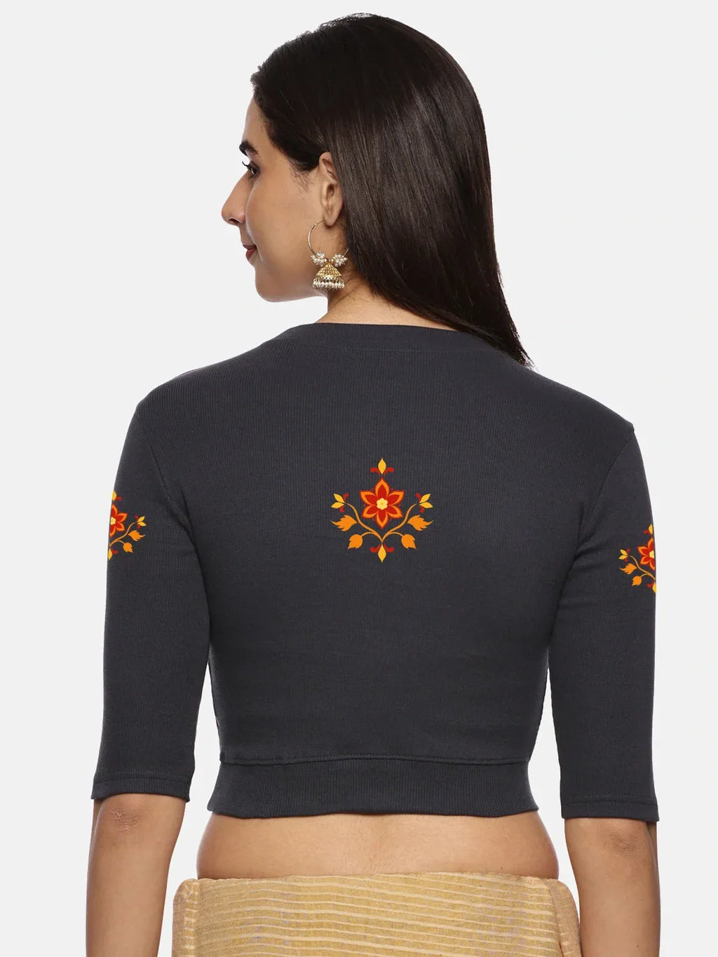 RIB blouse with back print in stretchable soft cotton, has a round neckline, sleeve length till the elbow. The blouse has a Rib double fold band at waist bottom to avoid spillage