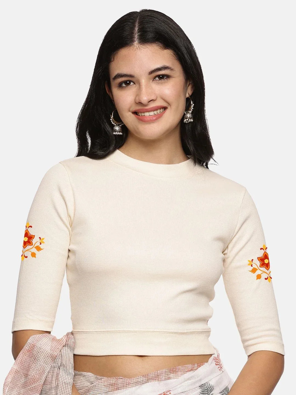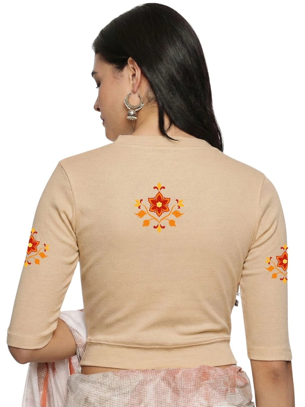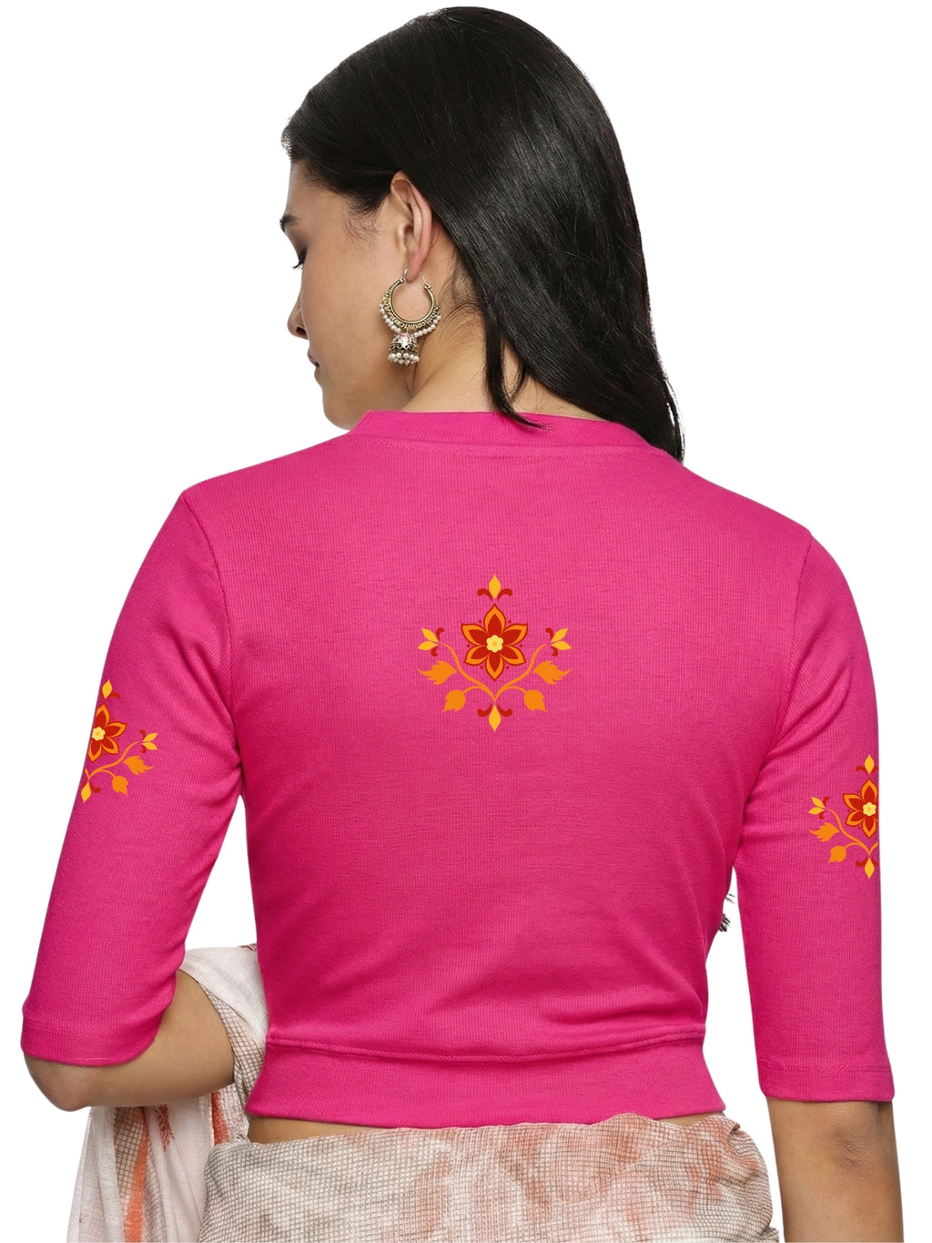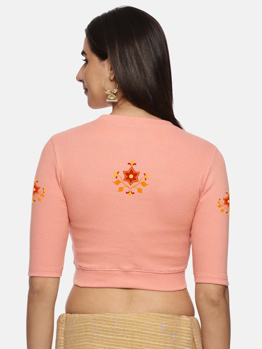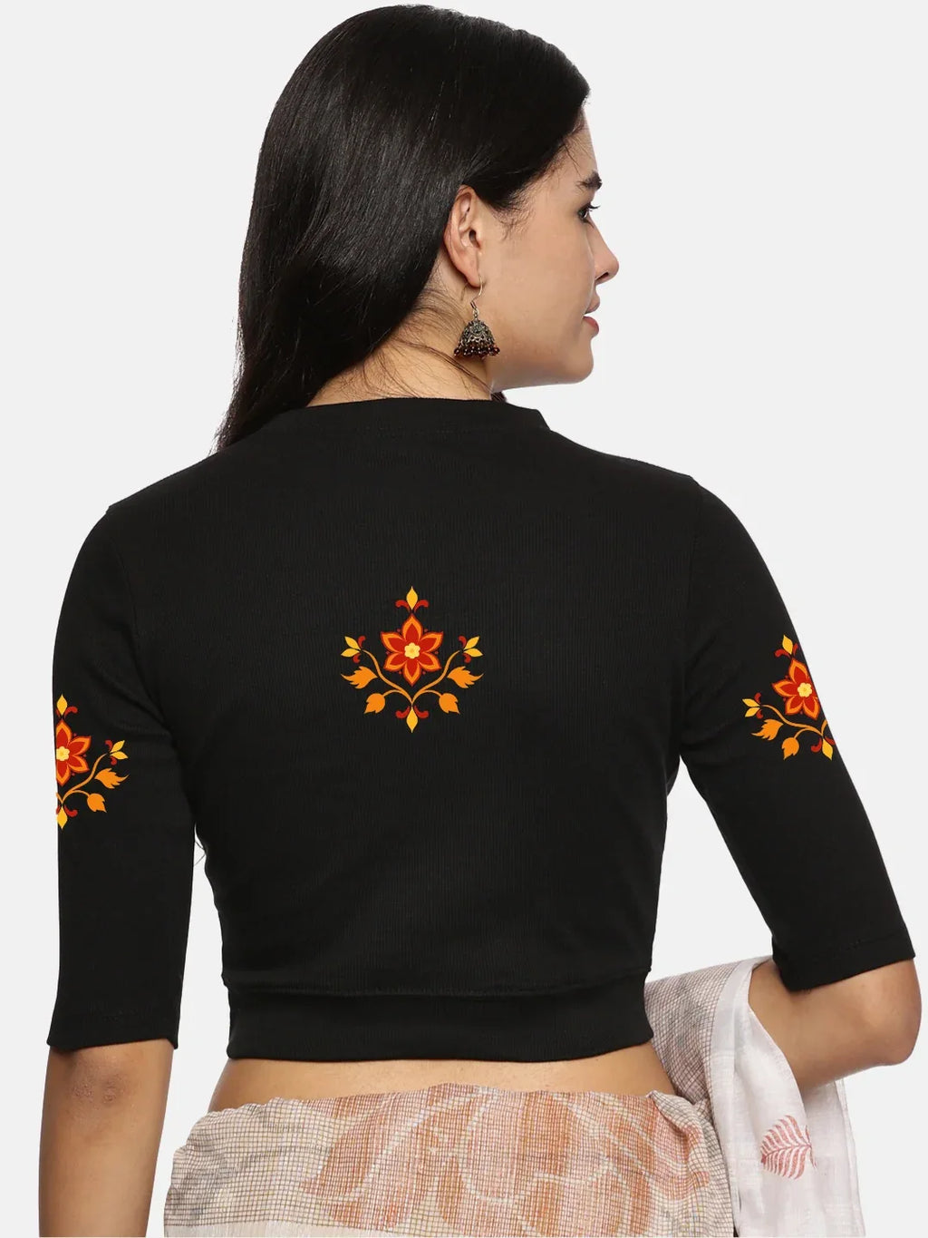 RIB blouse with back print in stretchable soft cotton, has a round neckline, sleeve length till the elbow. The blouse has a Rib double fold band at waist bottom to avoid spillage