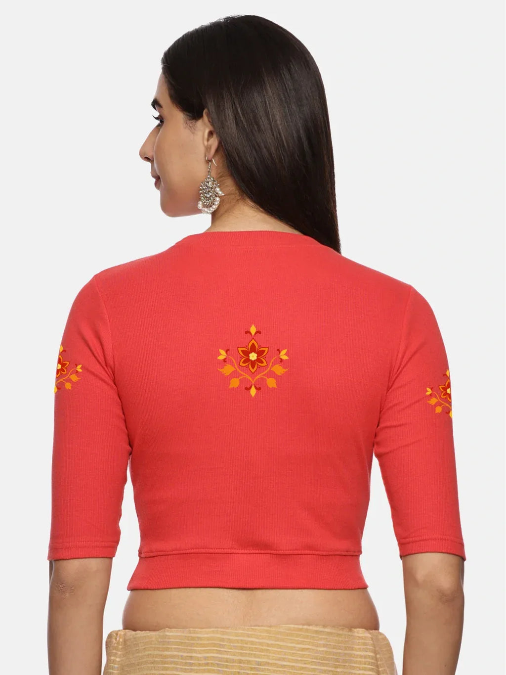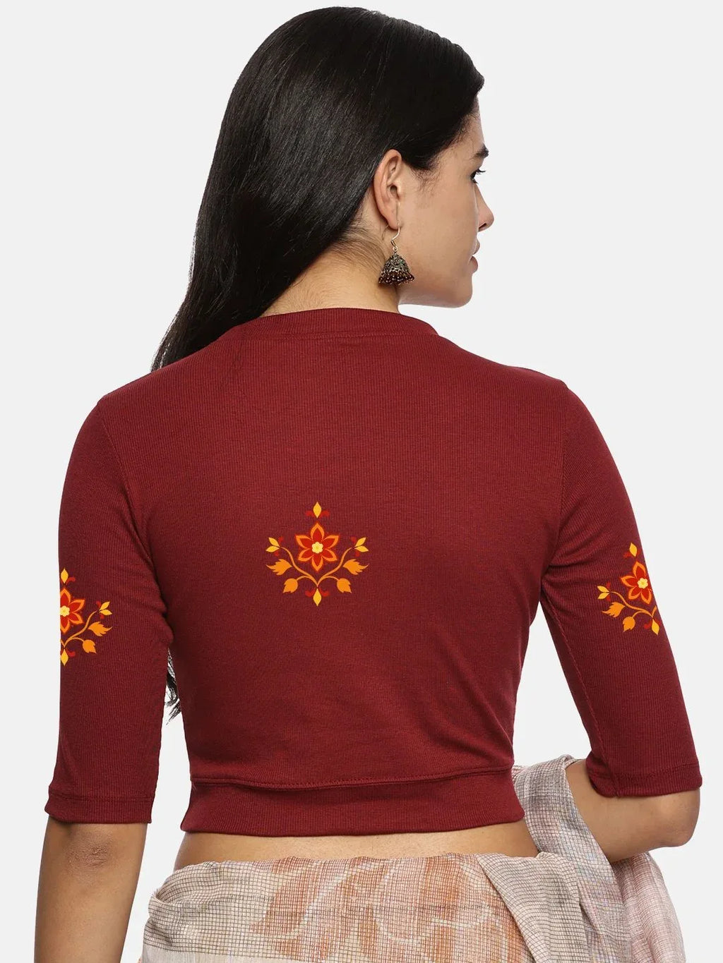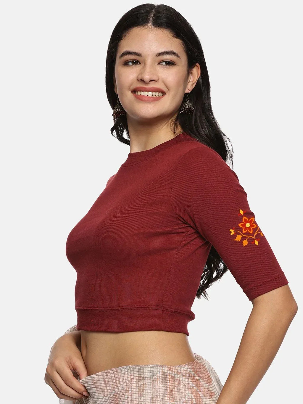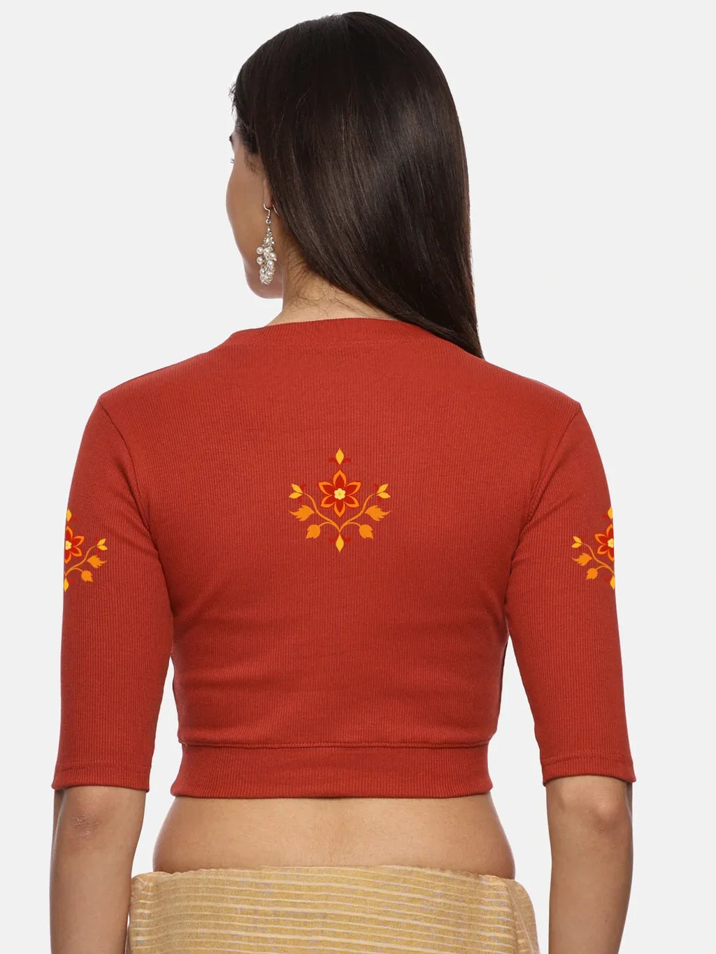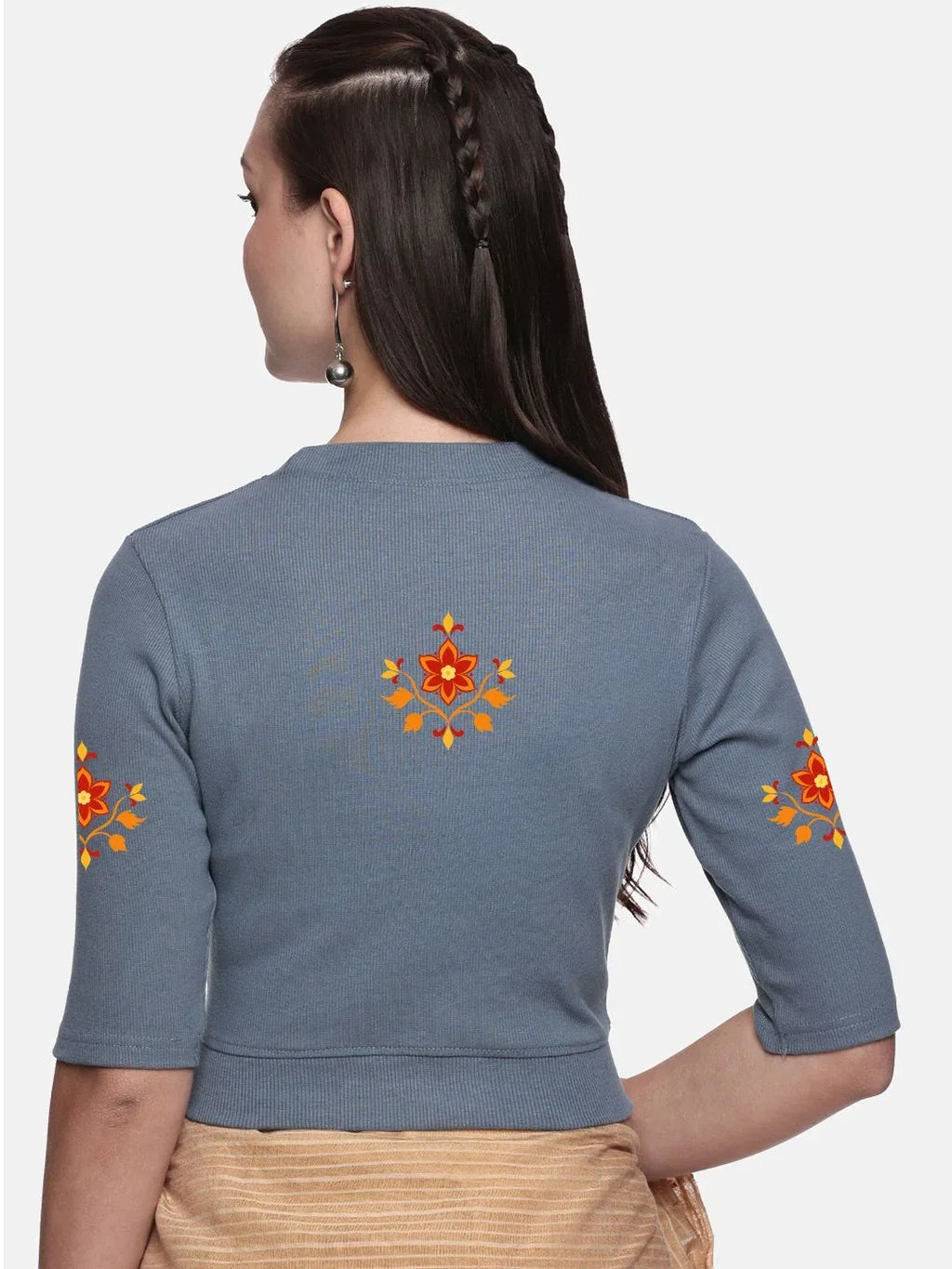 RIB blouse with back print in stretchable soft cotton, has a round neckline, sleeve length till the elbow. The blouse has a Rib double fold band at waist bottom to avoid spillage