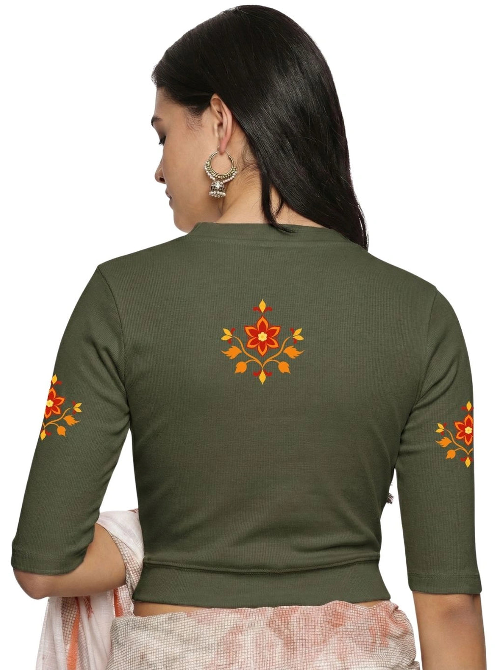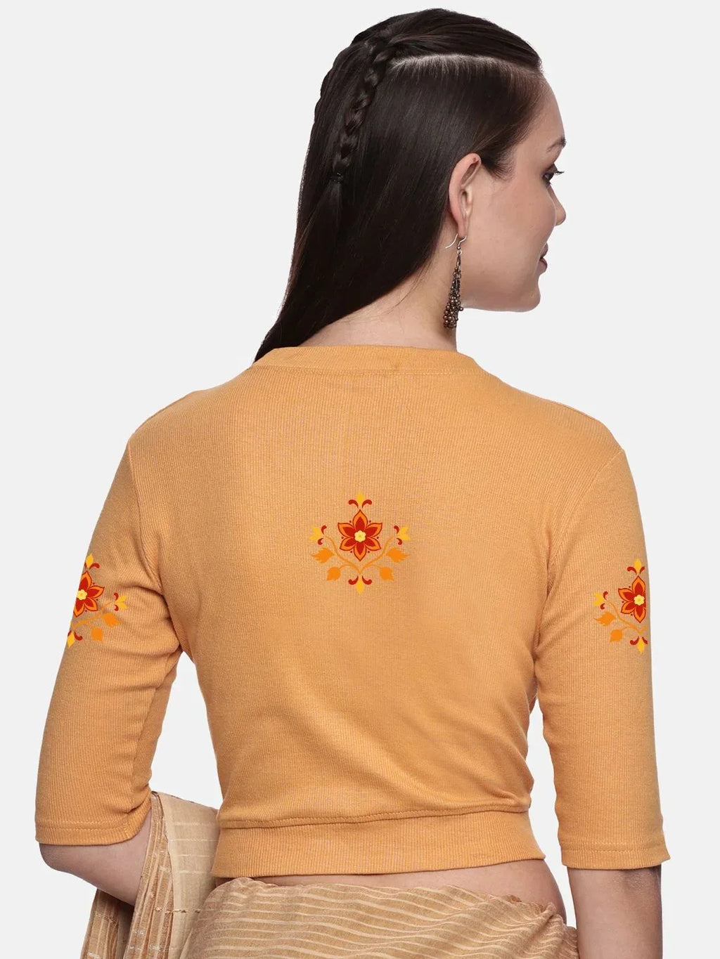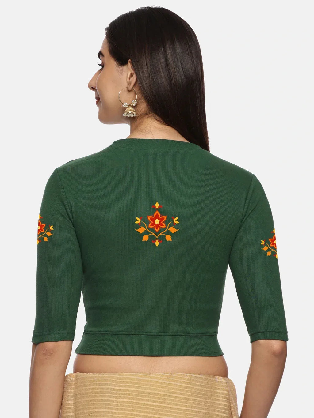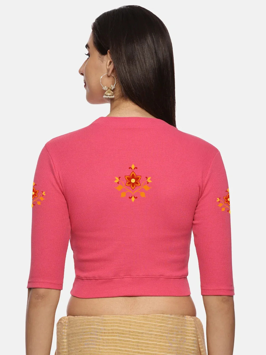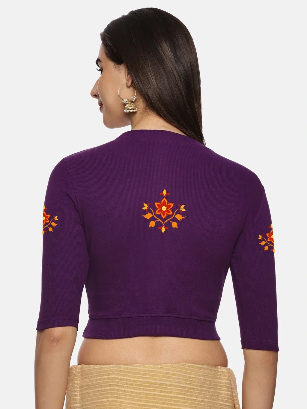 RIB blouse with back print in stretchable soft cotton, has a round neckline, sleeve length till the elbow. The blouse has a Rib double fold band at waist bottom to avoid spillage