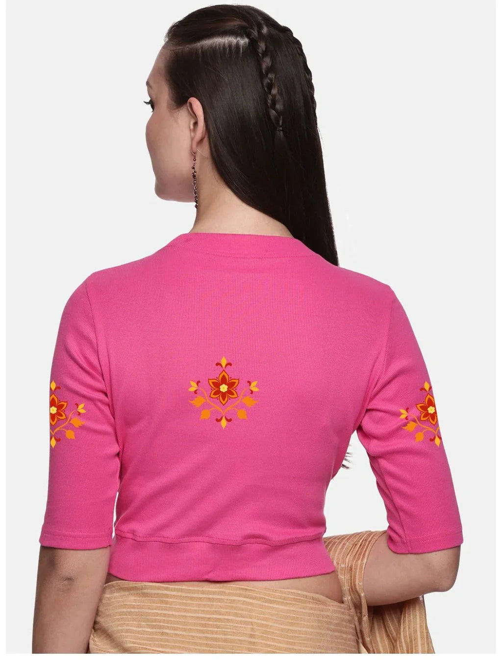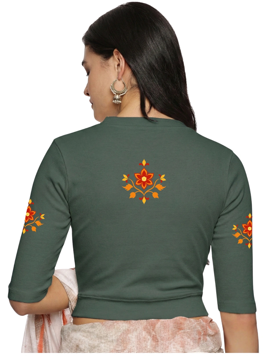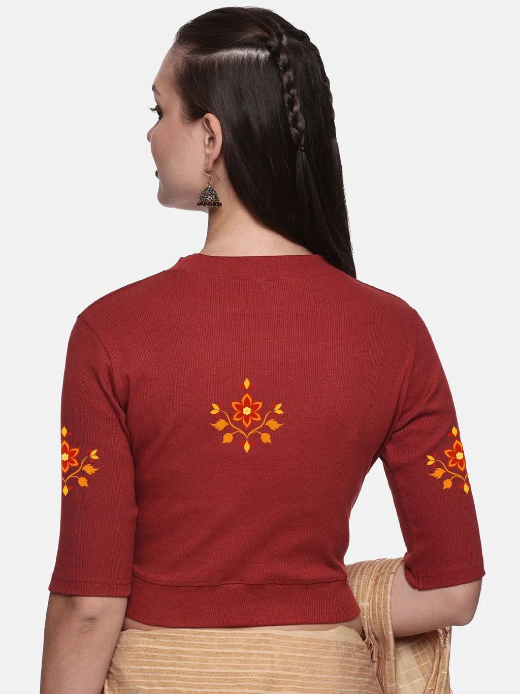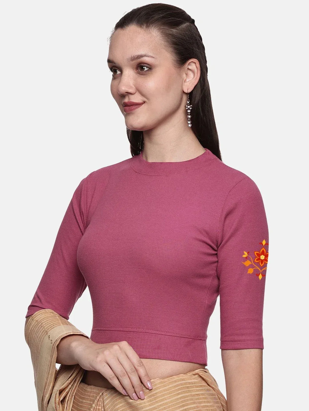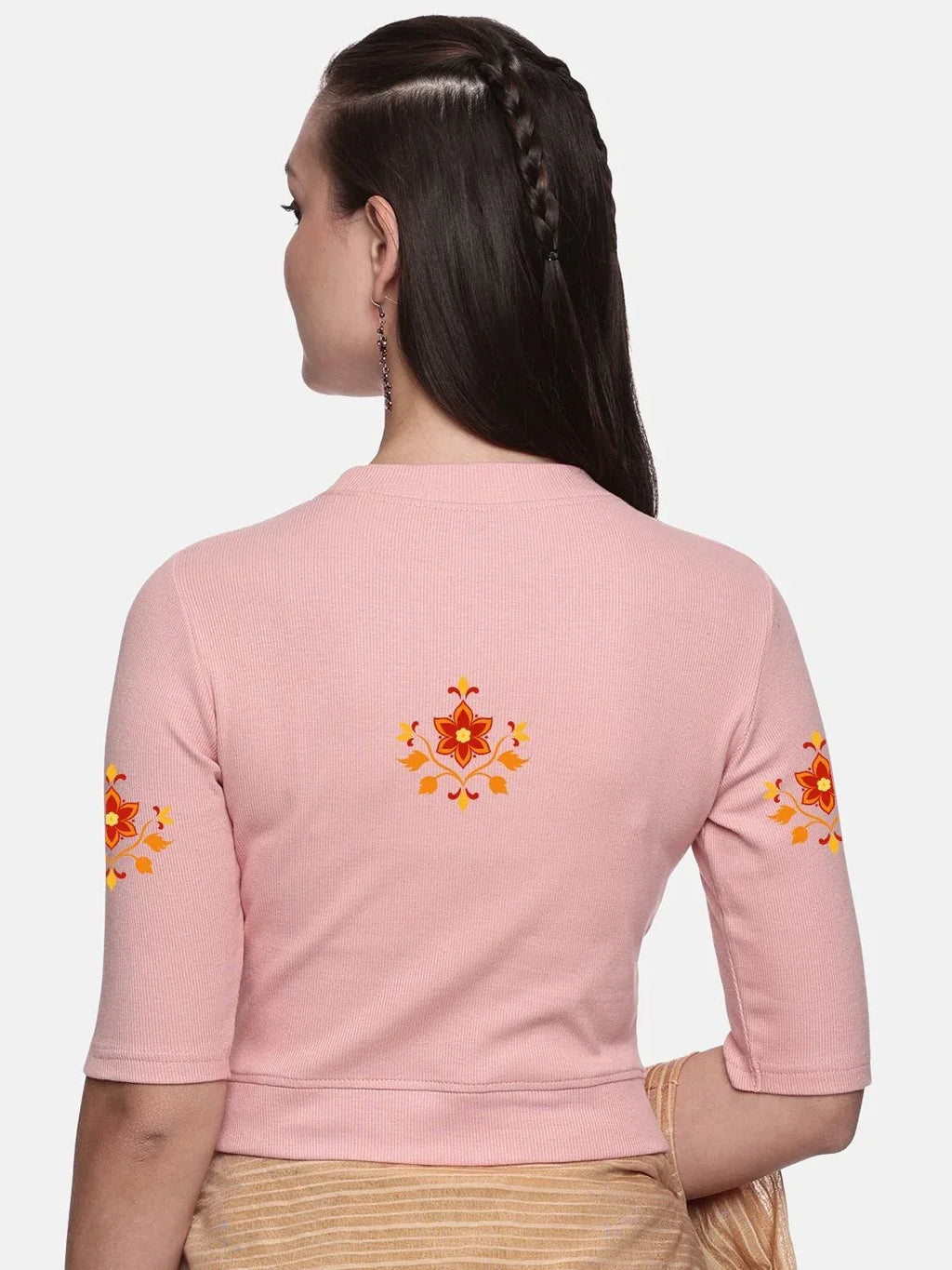 RIB blouse with back print in stretchable soft cotton, has a round neckline, sleeve length till the elbow. The blouse has a Rib double fold band at waist bottom to avoid spillage
