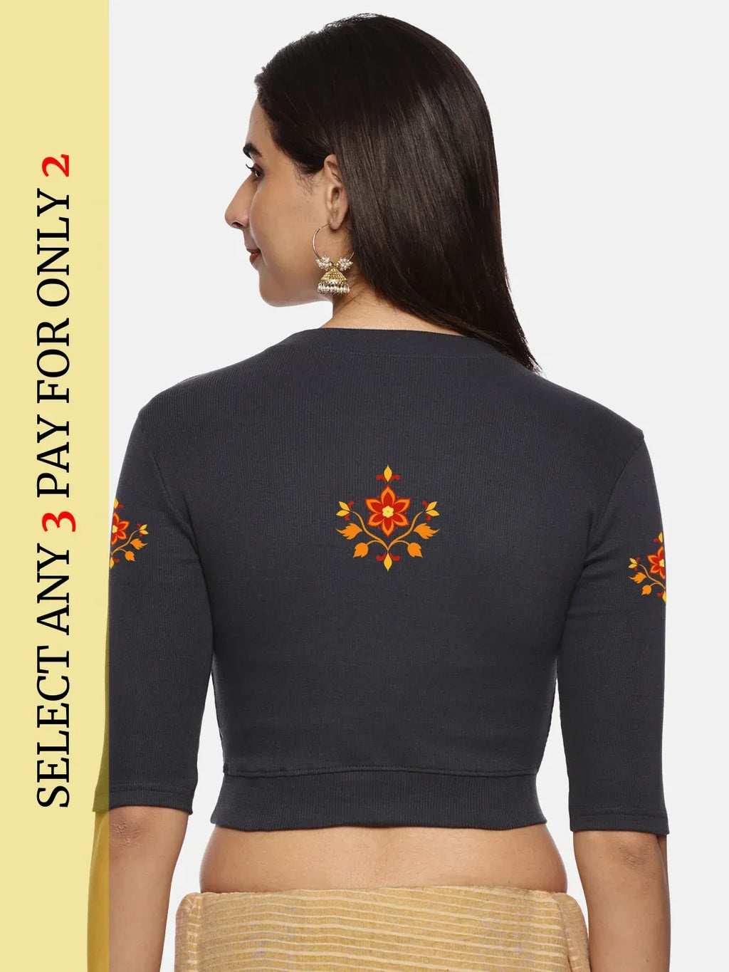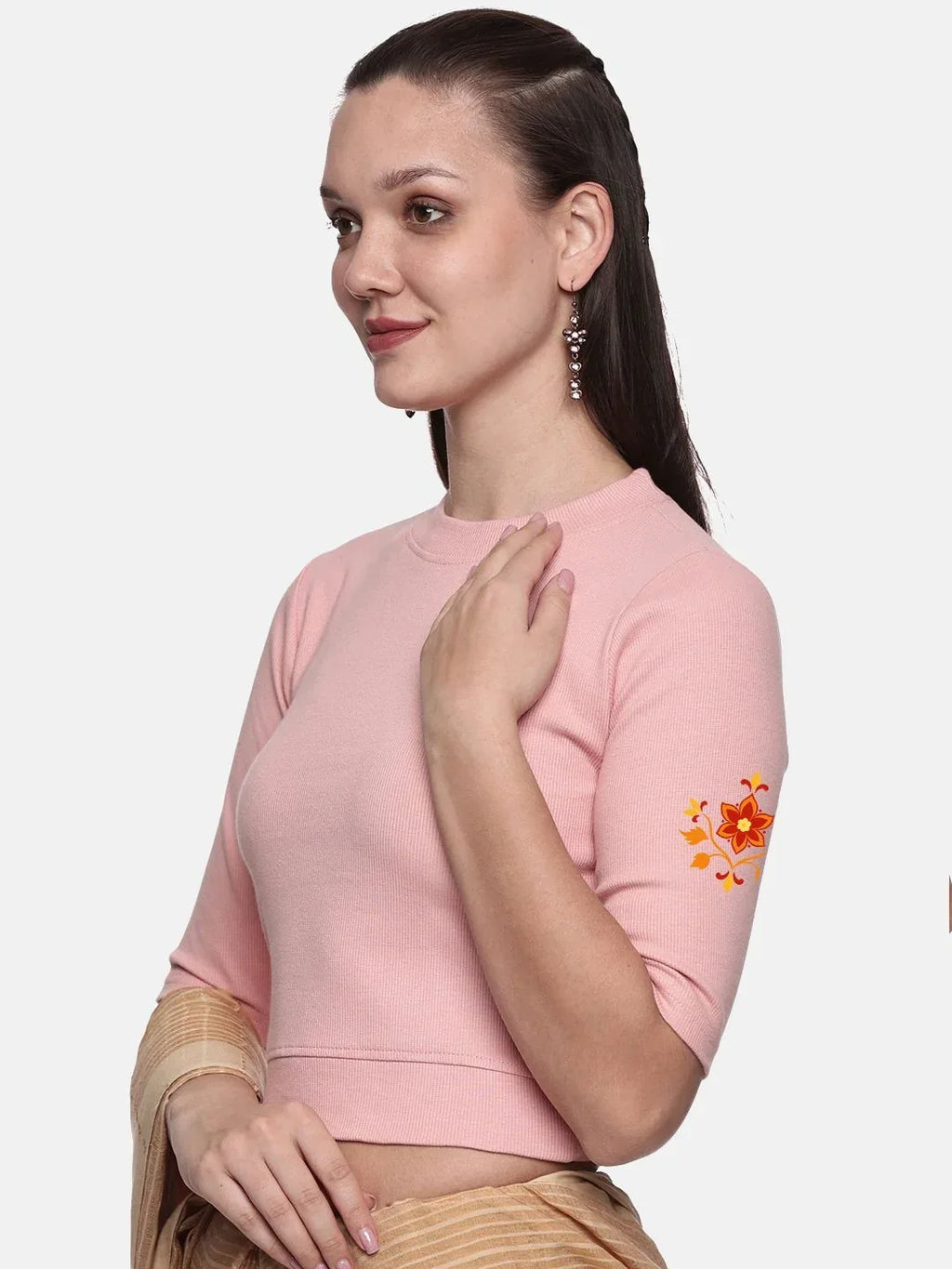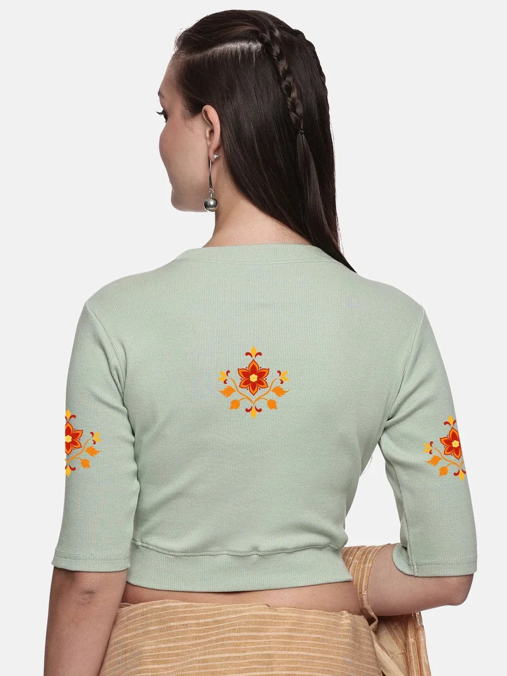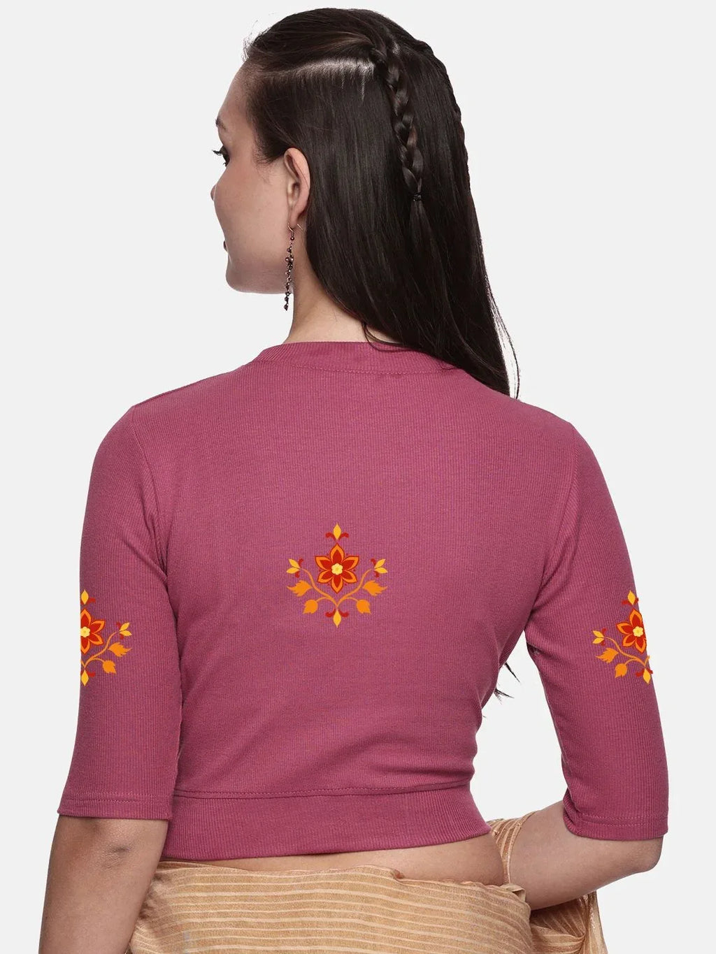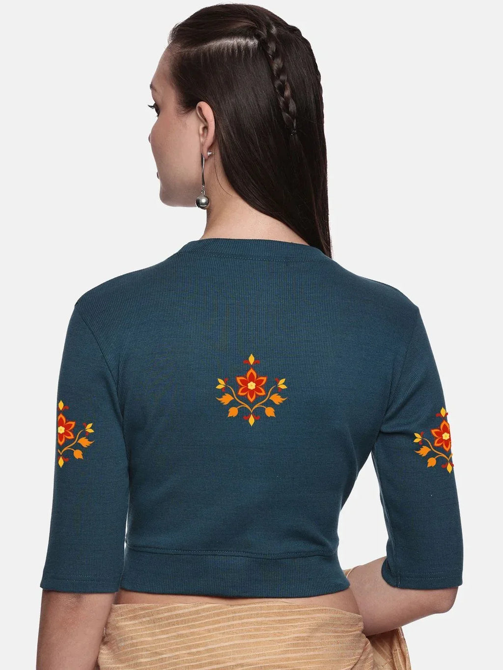 RIB blouse with back print in stretchable soft cotton, has a round neckline, sleeve length till the elbow. The blouse has a Rib double fold band at waist bottom to avoid spillage